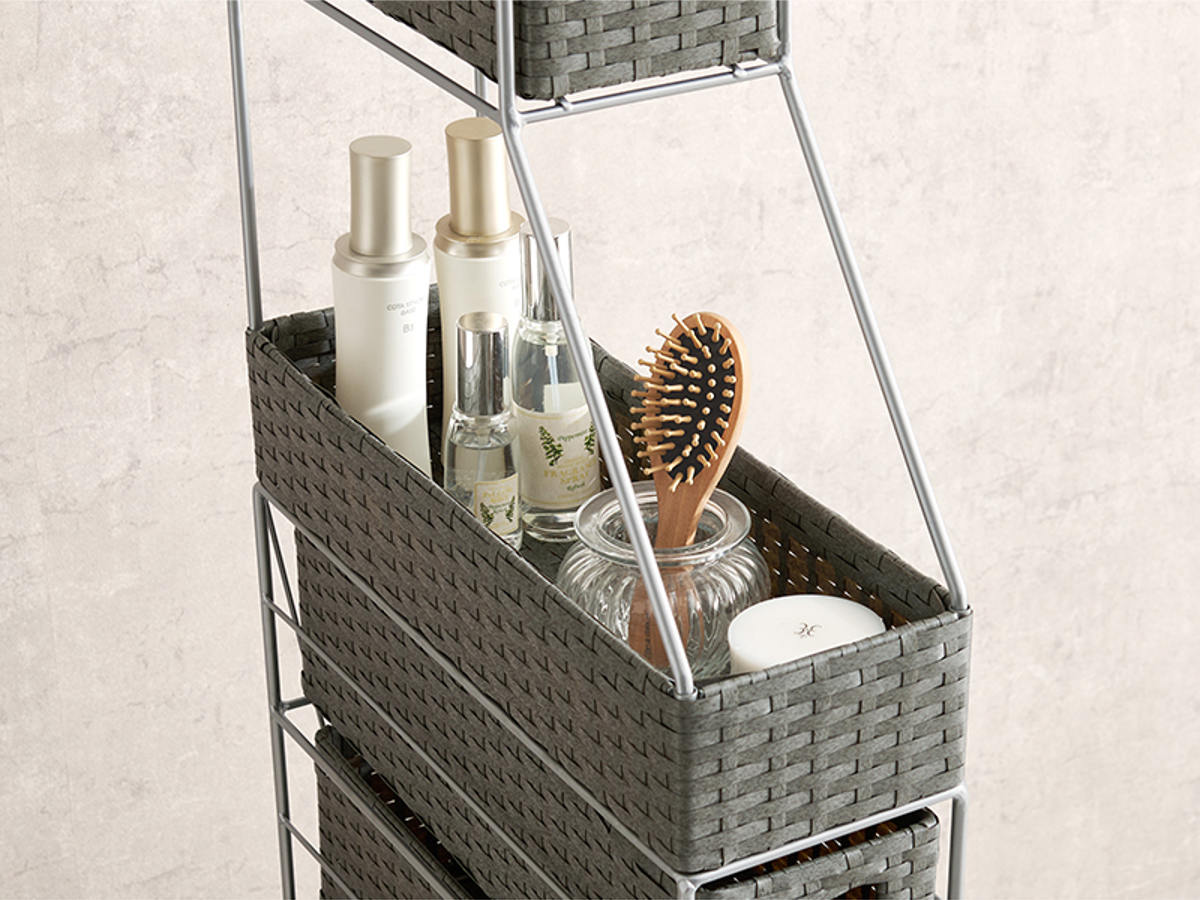 水に強い樹脂素材を編み込んだラタン調のデザインで、通気性に優れています。サッと拭き上げるだけで簡単にお手入れができるので、水回りでも活躍します。天然素材特有の節やささくれがなく、大切なお洋服やタオルを引っ掛けて傷付けにくいので安心です。