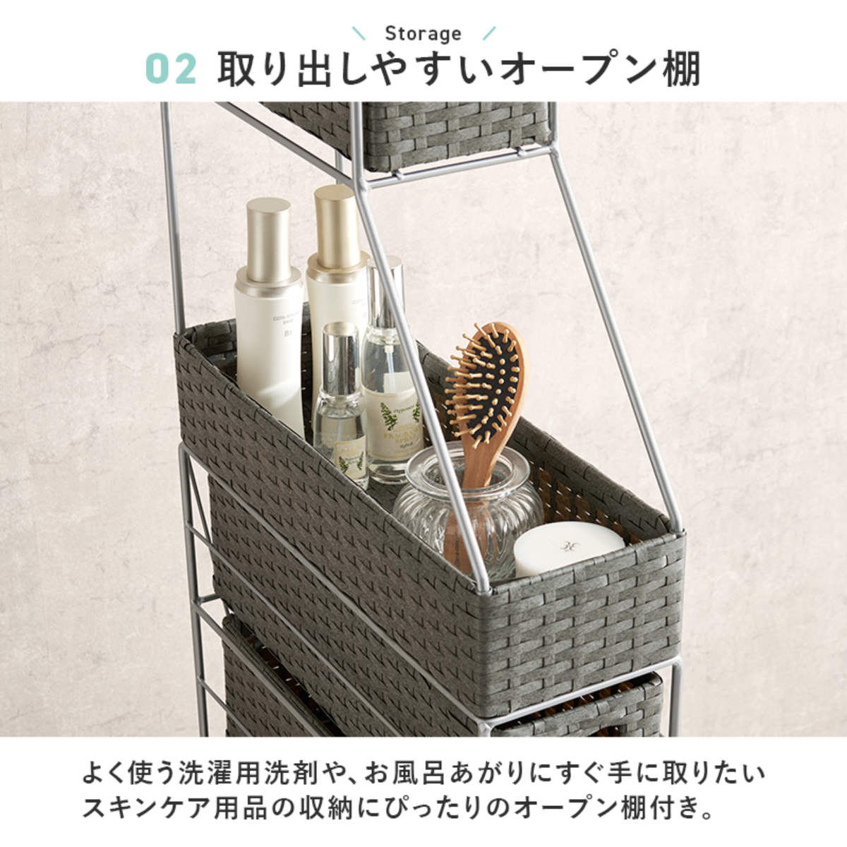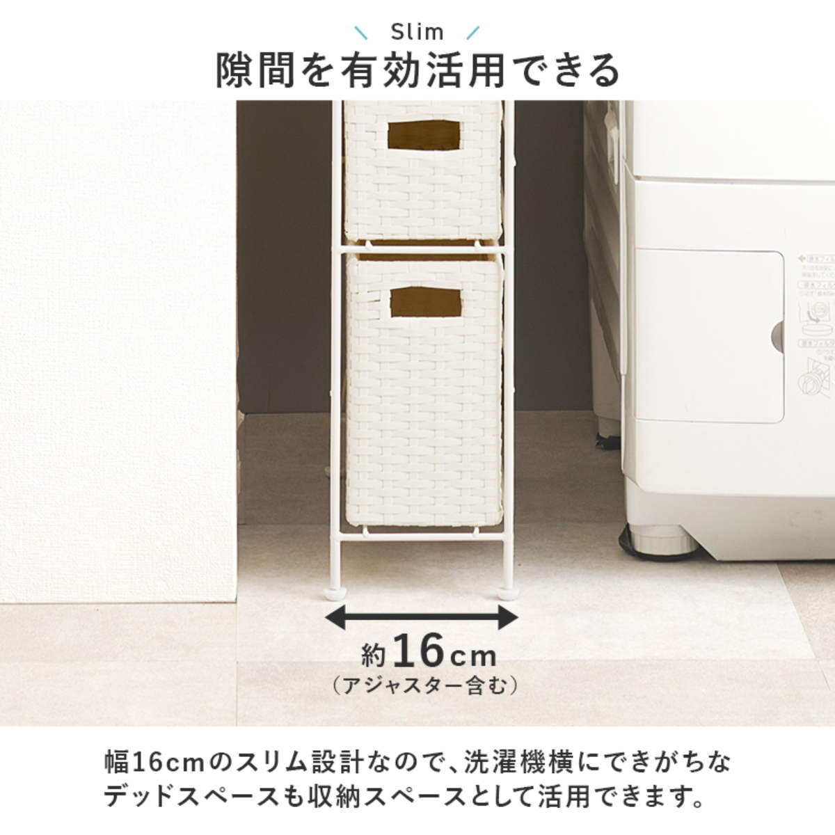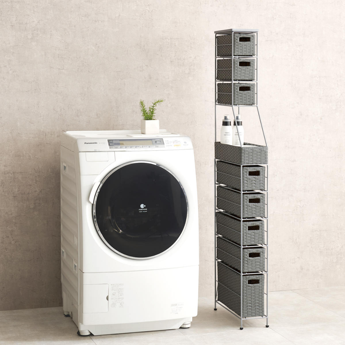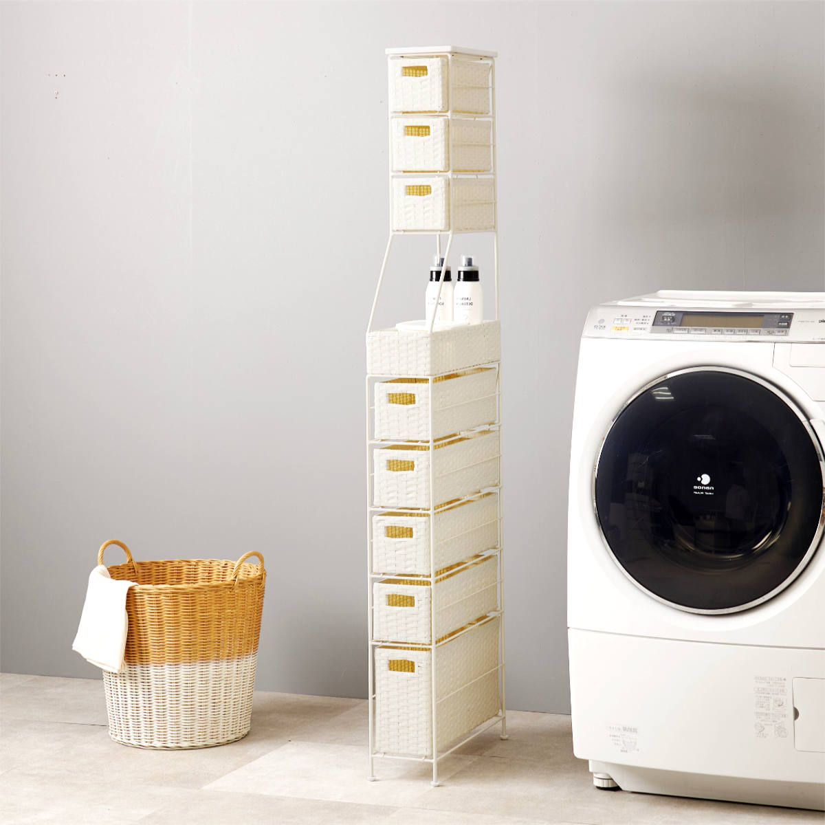 洗面所や脱衣所のちょっとした隙間に収まるランドリーチェストです。幅15cmのスリムなサイズ感ですが、豊富な収納スペースでしっかりと片付けられます。生活感が出てしまいやすいランドリールームも、ラタン調のバスケットで美しく爽やかな空間に。