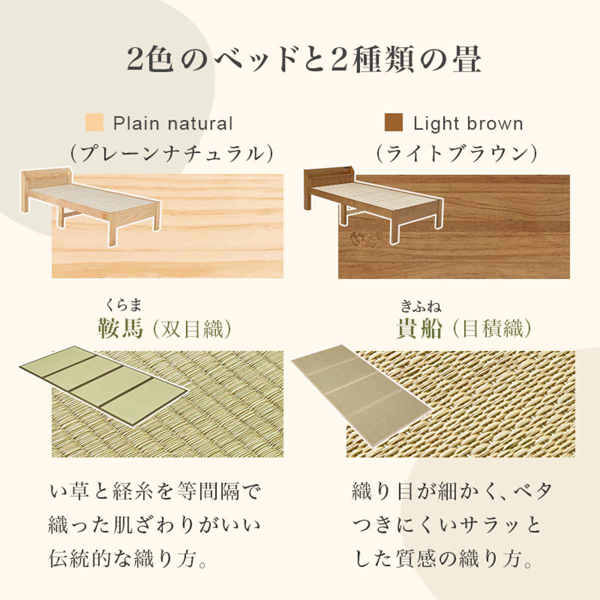和室・洋室どちらのお部屋にも自然に溶け込むデザインで、2色のベッドフレームと2種類の畳からお選びいただけます。