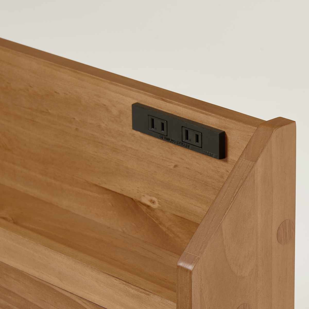 眼鏡や目覚まし時計などの小物を置くことができる宮棚付きです。棚には2口コンセントが付いているので、枕元でライトを灯しながら同時にスマホやタブレットを充電することができます。