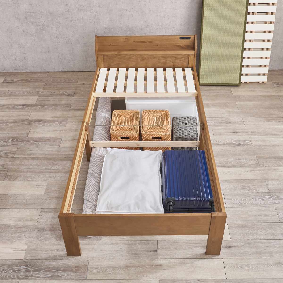 ベッド下は収納スペースとしてお使いいただけます。収納ケースの他、キャリーバッグやラグ、布団、季節用品など、かさばるものや使用頻度の低い物の収納にもぴったりです。