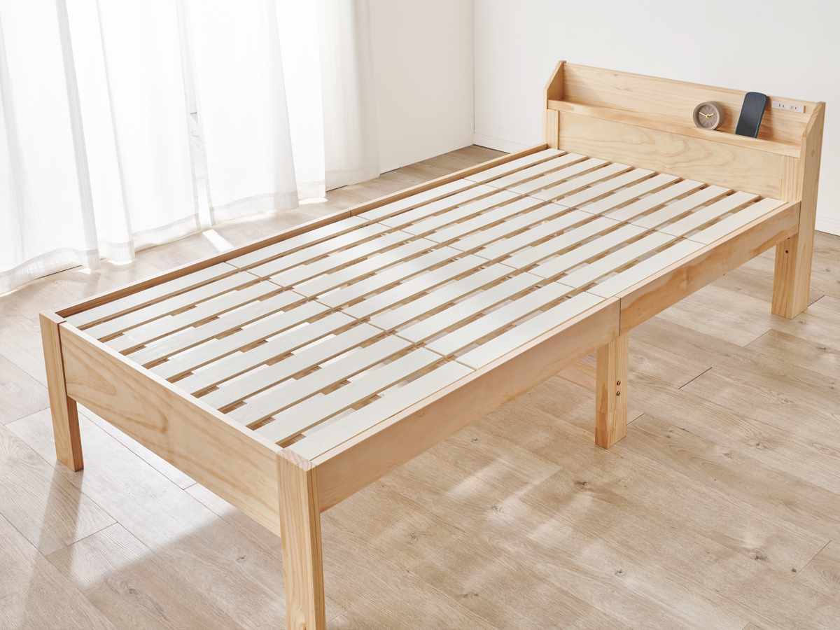 ベッドフレームには天然木の温もりが感じられる柔らかなパイン材を使用。美しい木目と経年による色の変化を楽しめます。