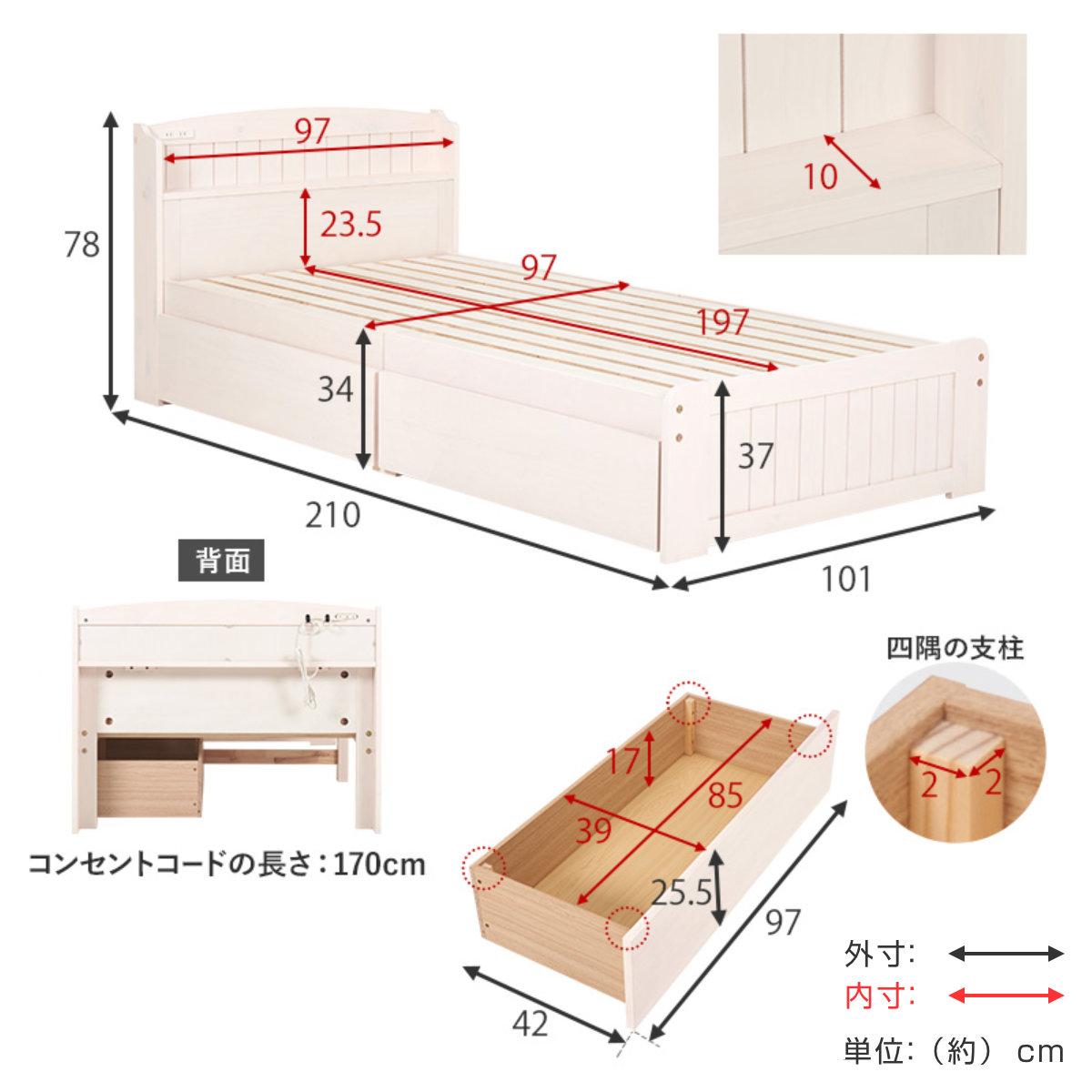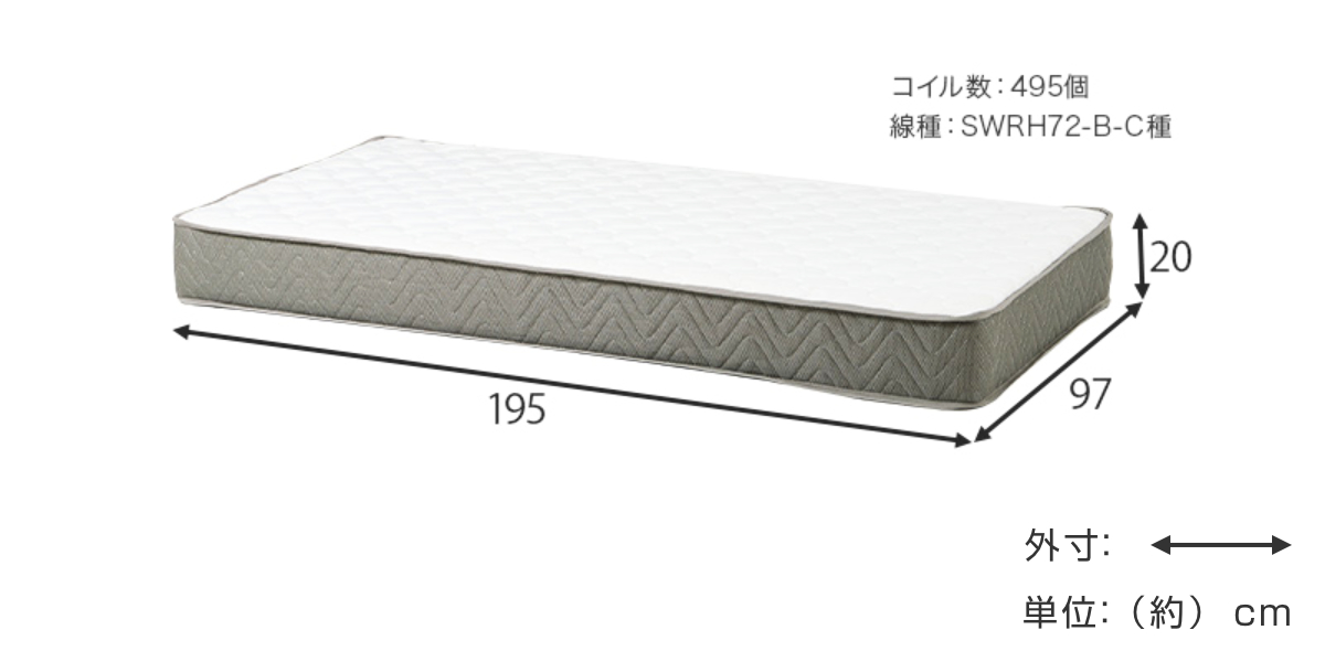| サイズ | ベッド:約 幅101×奥行210×高さ78(cm) マットレス:約 幅97×奥行195×高さ20(cm) |