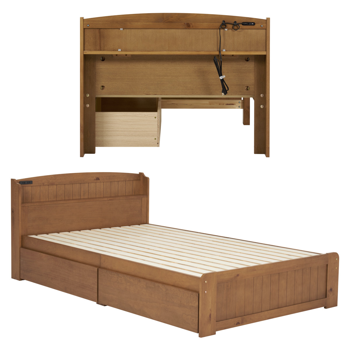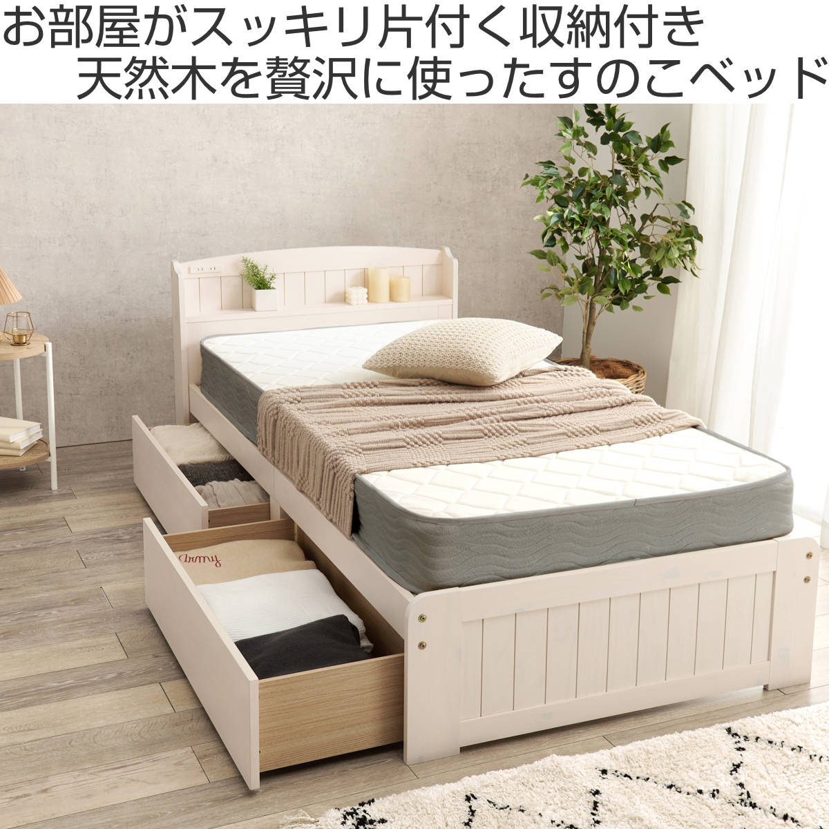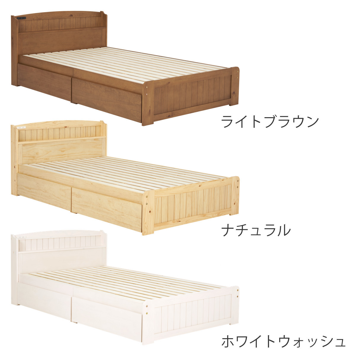 ベッド シングル 引出し2杯 ポケットマットレス付 すのこ 宮棚 2口コンセント付 天然木 ( 収納 マットレス付 引出し マットレスセット ベッドフレーム ボンネルコイル 厚さ20cm ライトブラウン ナチュラル ホワイトウォッシュ ) 【ナチュラル】