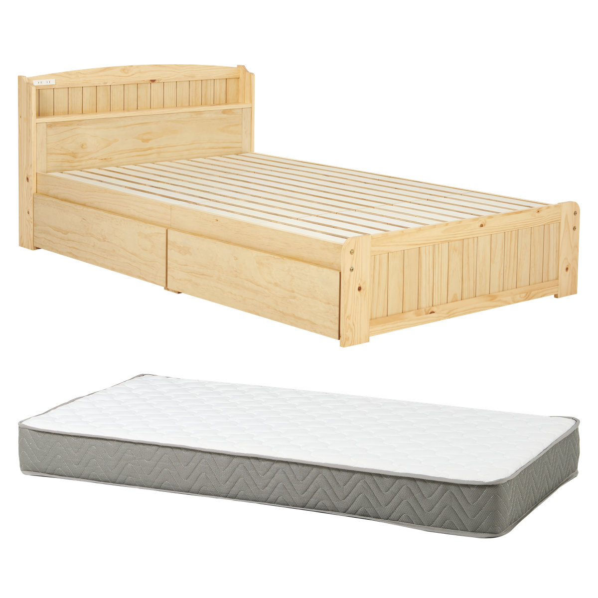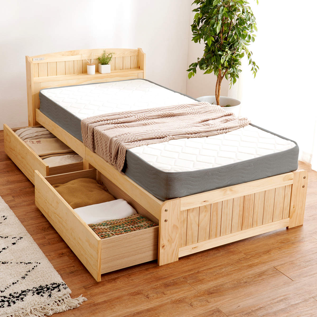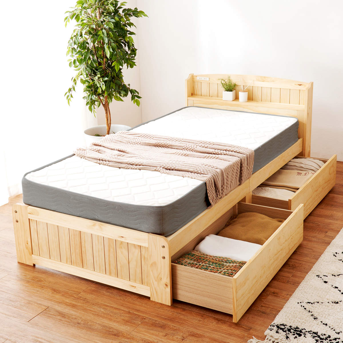 ナチュラルな風合いがお部屋に馴染むベッドフレームとポケットコイルマットレスのセットです。大容量の引出しが付いているので、スペースに限りがあるワンルームや子供部屋などでも活躍します。天然木の温もりが感じられる柔らかなパイン材を使用し、美しい木目と経年による色の変化も楽しめます。