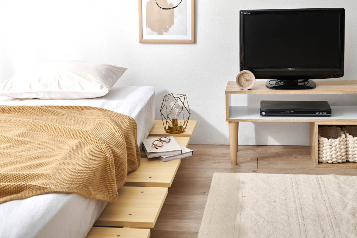 フレームよりも小さいサイズのマットレスと合わせると、余白が生まれお洒落な雰囲気になるローベッドです。サイドに小物などを置けるステージベッドとしてお使いいただけます。一般的なベッドよりも幅が広いので、ゆとりのあるベッドスタイルが実現します。