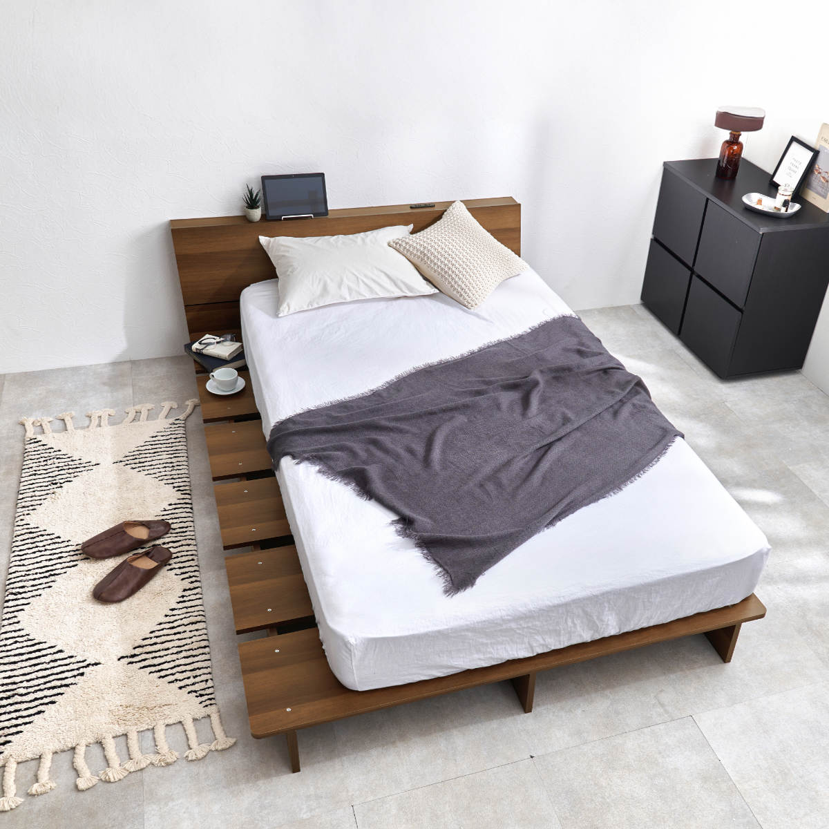 ローベッド シングル ボンネルマットレス付 背もたれ 2口コンセント付 余白デザイン ( ベッド マットレス付 耐荷重350kg ステージ ロータイプ ベッドフレーム ボンネルコイル 厚さ14.5cm マットレスセット ブラウン ナチュラル ) 【ナチュラル】