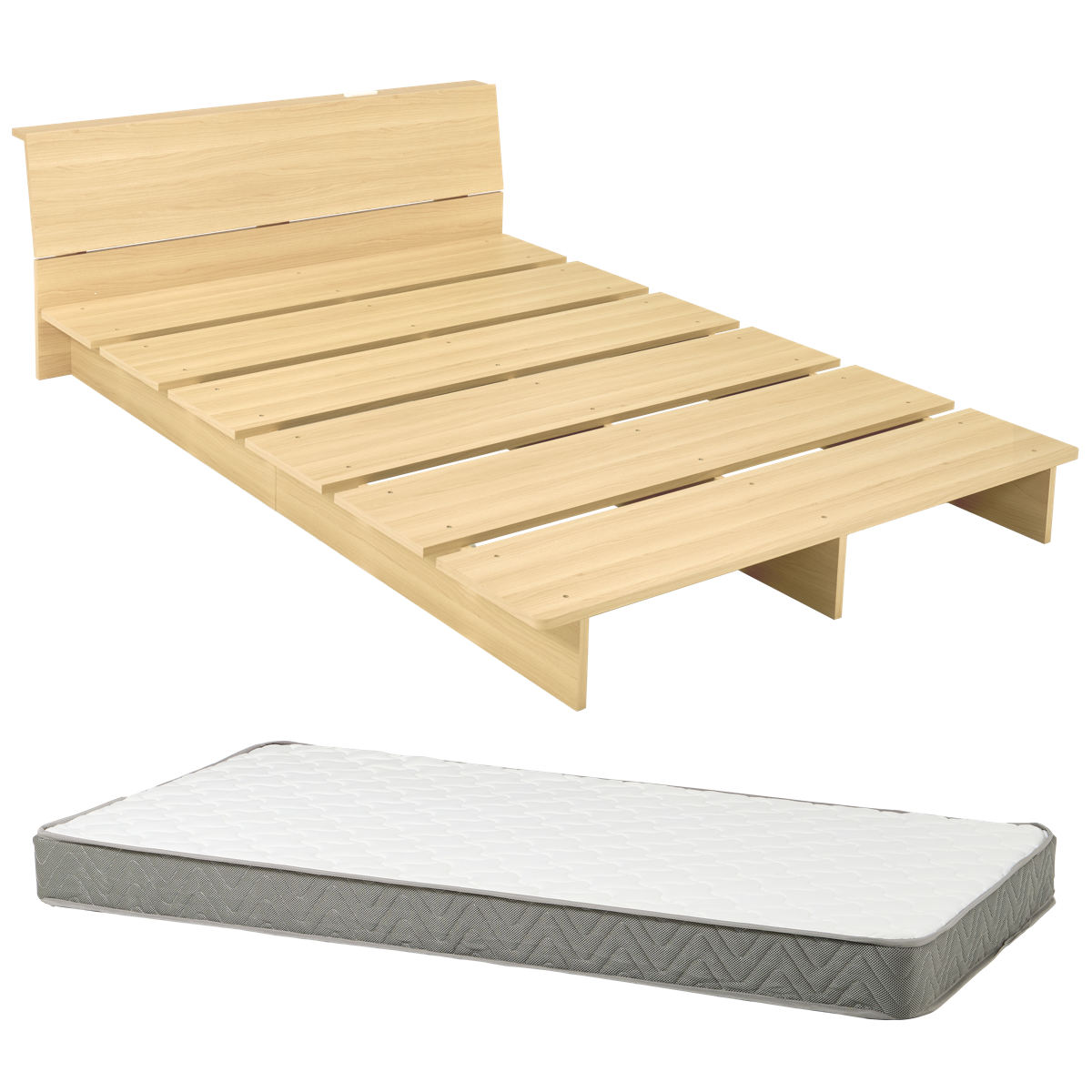 ローベッド セミダブル ボンネルマットレス付 背もたれ 2口コンセント付 余白デザイン ( ベッド マットレス付 耐荷重350kg ステージ ロータイプ ベッドフレーム ボンネルコイル 厚さ14.5cm マットレスセット ブラウン ナチュラル ) 【ナチュラル】