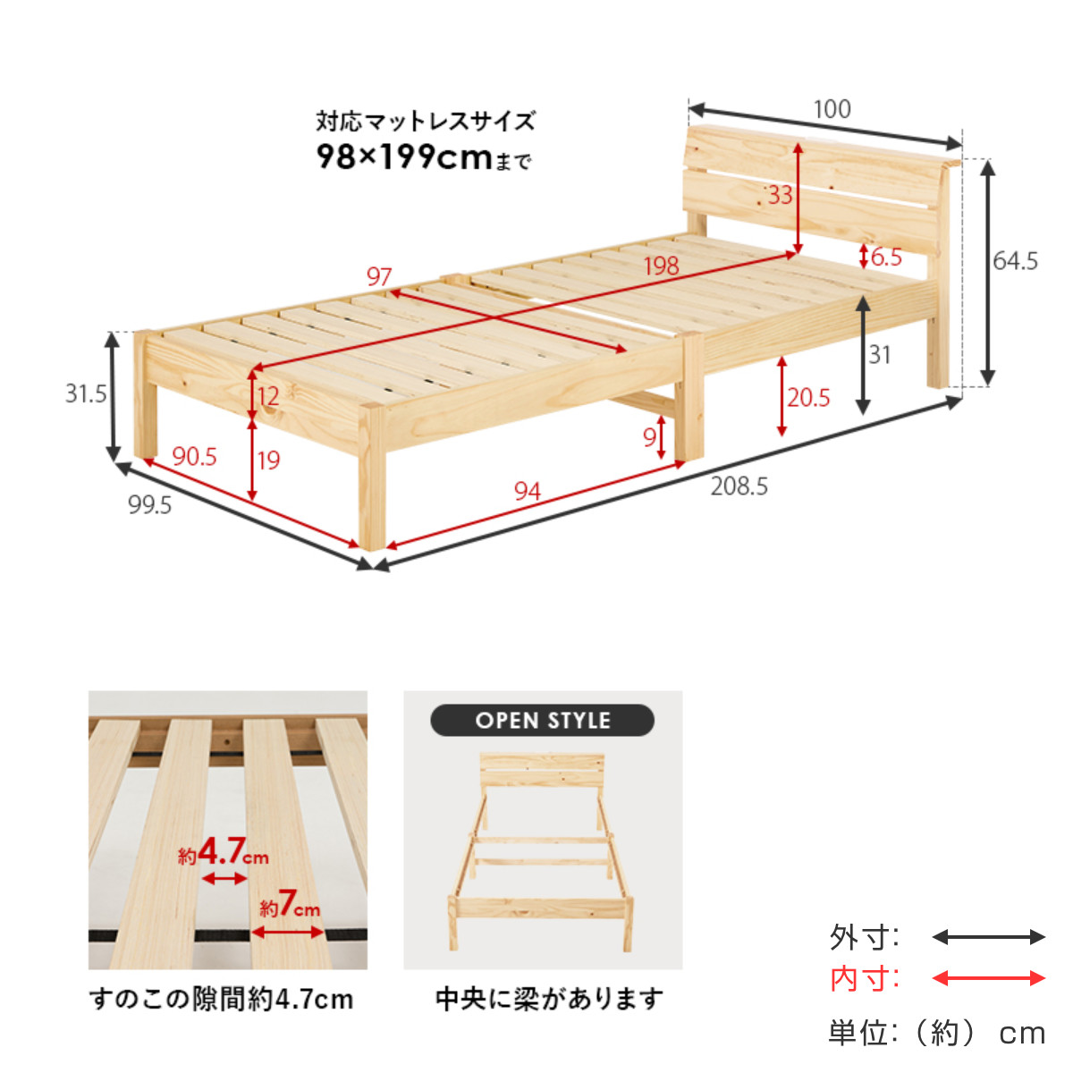 | サイズ | ベッド:約 幅100×奥行208.5×高さ64.5(cm) マットレス:約 幅97×奥行195×高さ14.5(cm) |