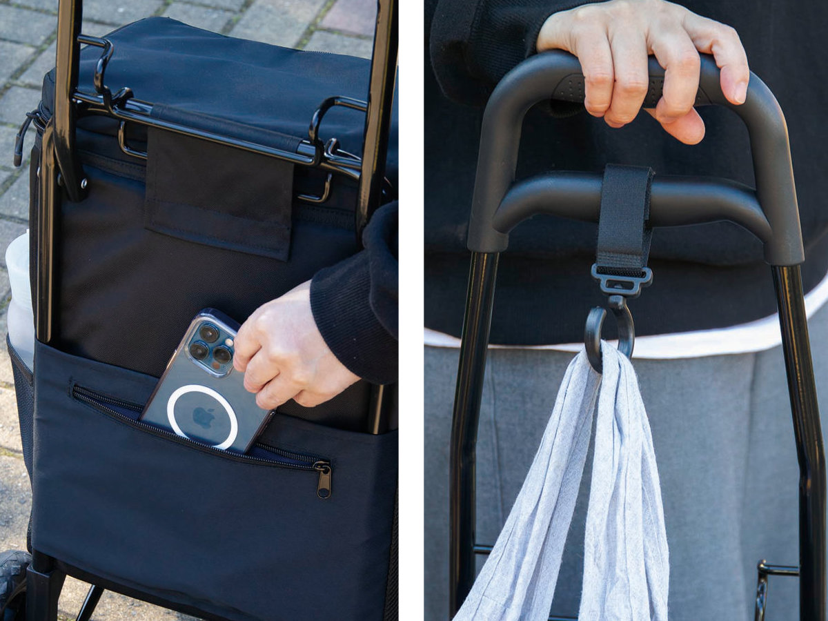 スマホや小物類を収納できるポケットや他のエコバッグなどを吊り下げられるフックなど、ストレスなくお買い物を楽しめる機能が充実しています。