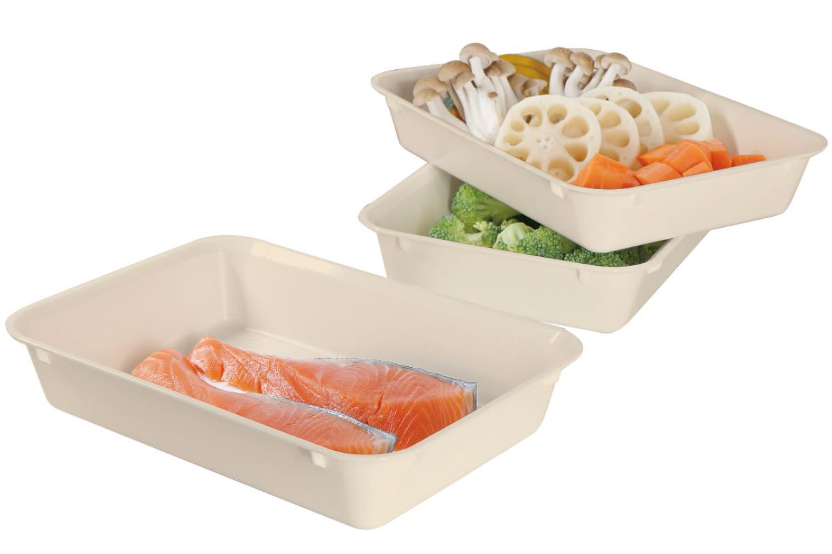 積み重ねできる角型のザル・トレーのセット。切った野菜や下ごしらえした食材をそのまま重ね置きできます。キッチンがスッキリ片付き、作業スペースをしっかり確保できます。