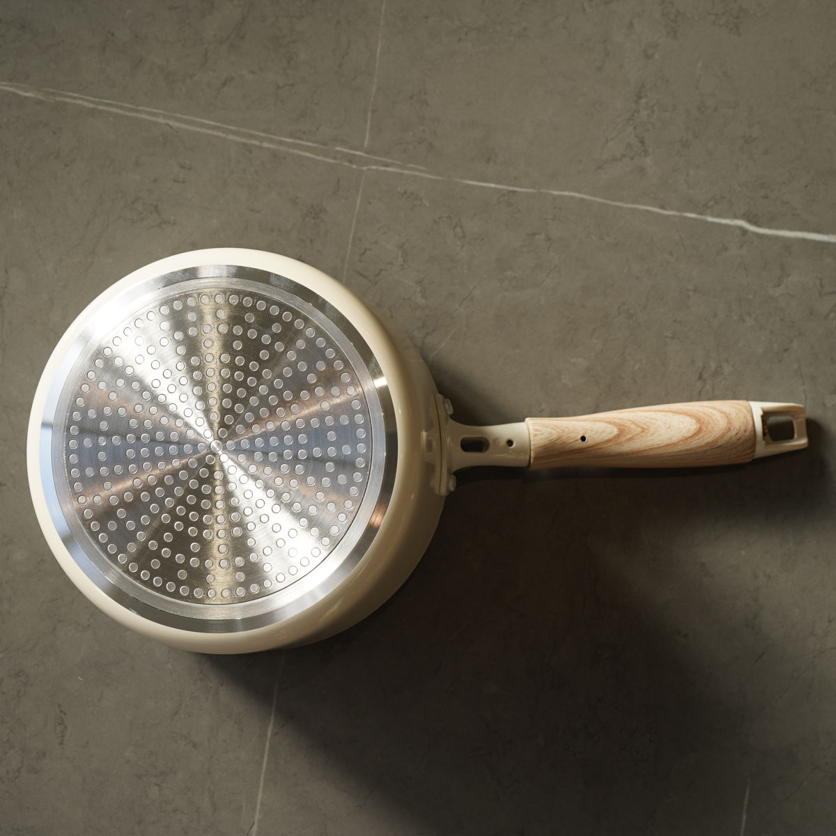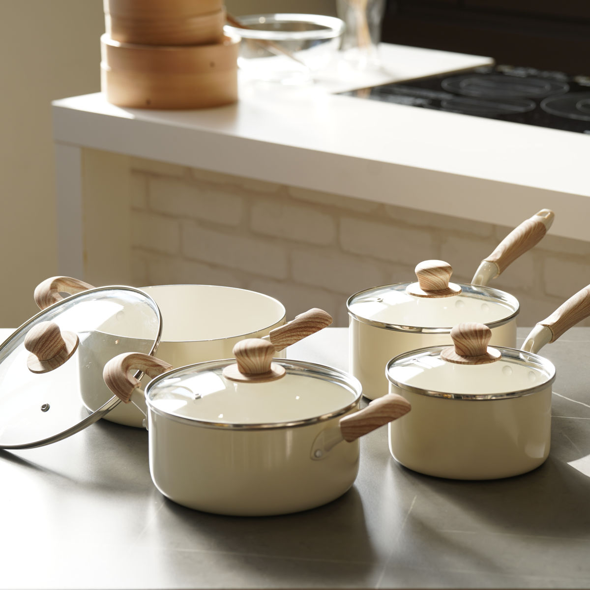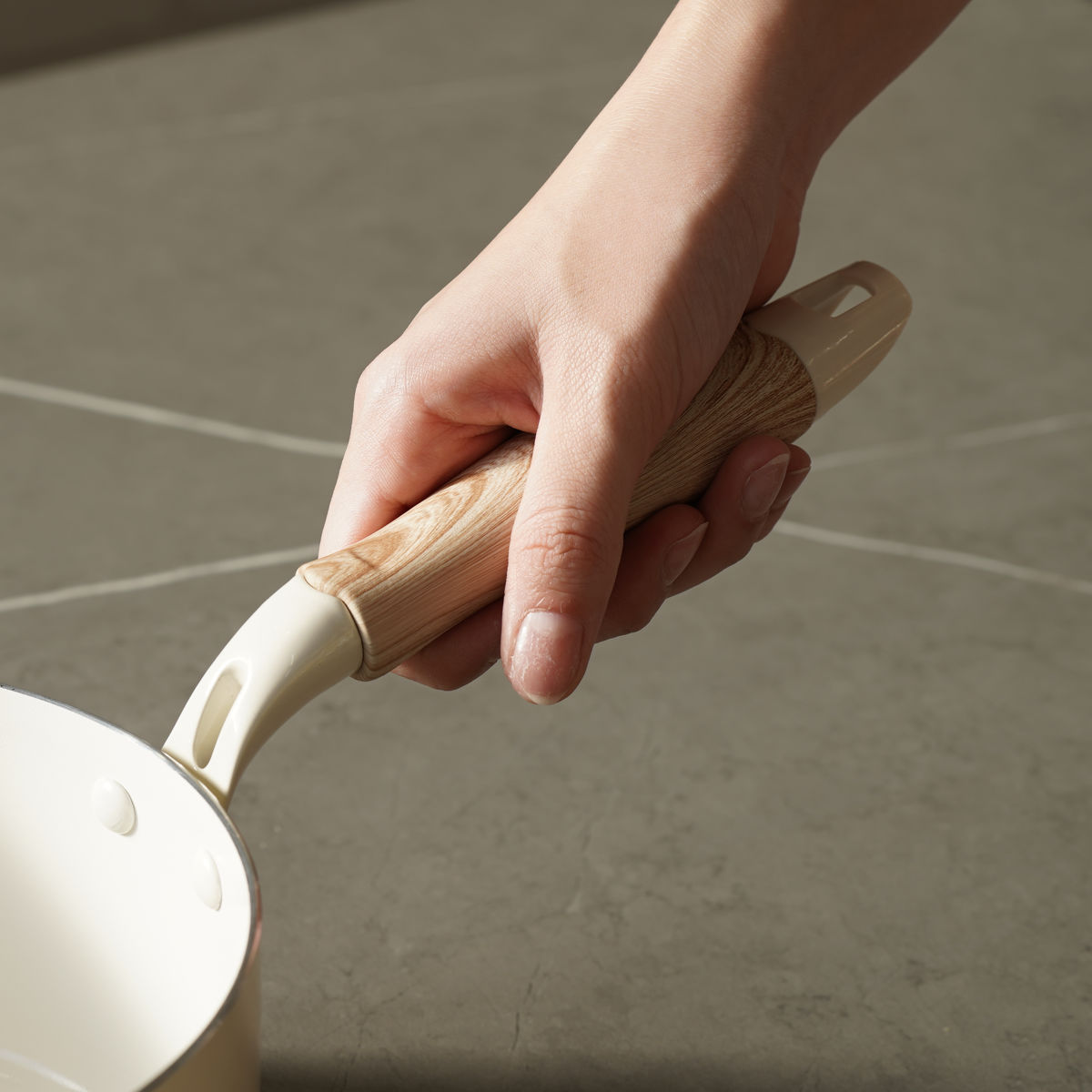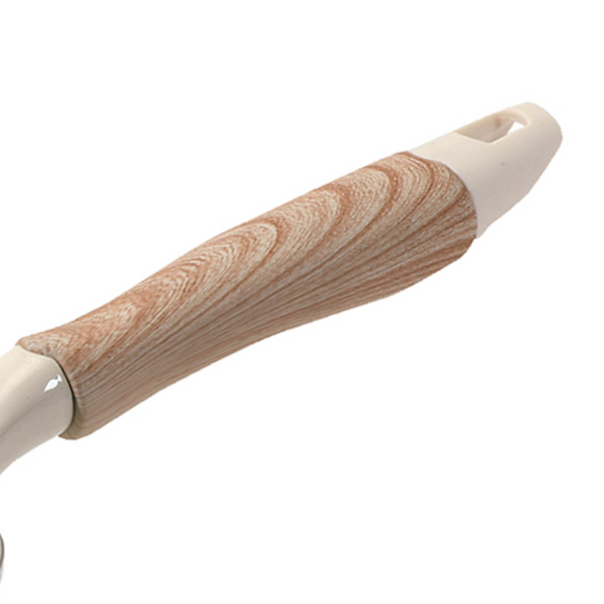 つまみとハンドルは木目柄で、ナチュラルなキッチンに馴染むデザイン。フェノール樹脂素材を使用しているので、滑りにくく、熱くなりにくいのもポイントです。