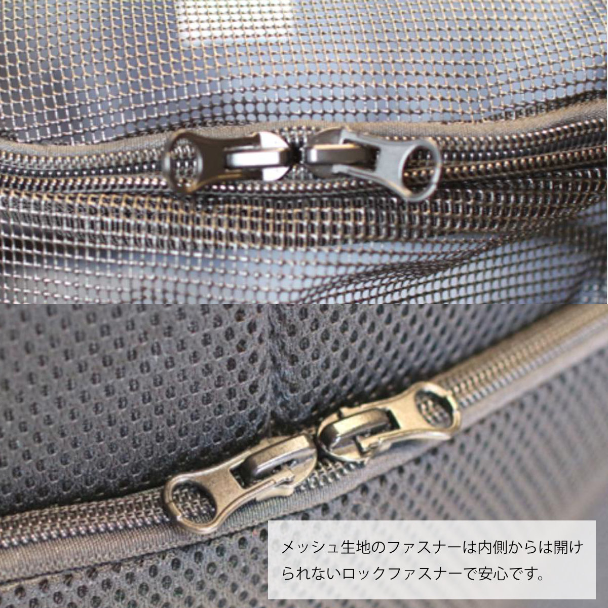 内側から開かないロックファスナーを採用しています。ペットが勝手に開けてしまう心配がありません。