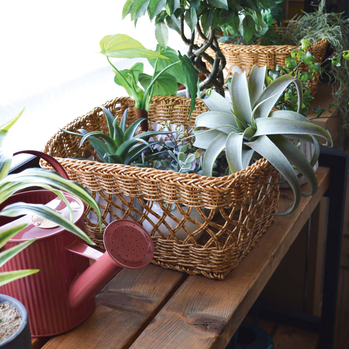 水や湿気に強く多湿な空間でも活躍します。洗面所やパウダールームの小物入れ、ガーデニング用品の収納、観葉植物カバーにも適しています。