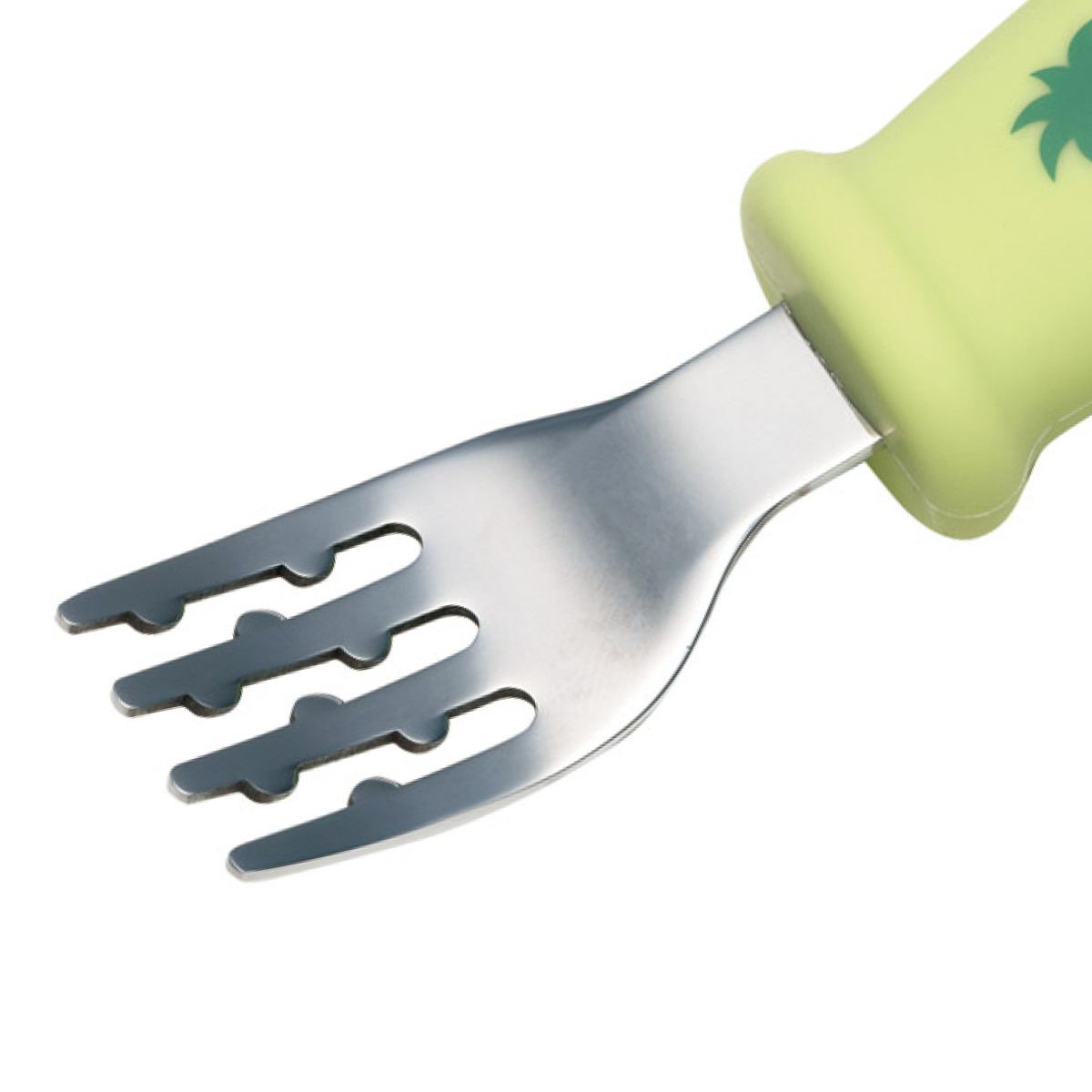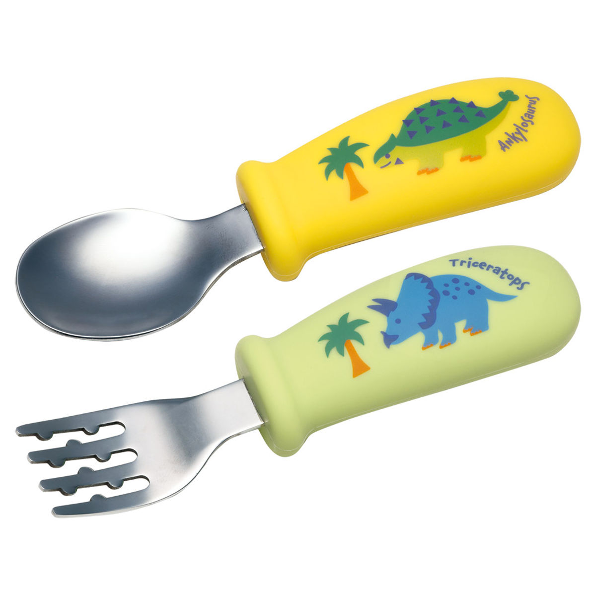 ディノサウルスのデザインが可愛いお子様用スプーンとフォークのセットです。小さな手でも握りやすい、太めの立体シリコーングリップを採用。滑りにくい指かけ付きでお食事の練習をサポートします。12か月頃から使えるので、初めてのカトラリーにもぴったりです。