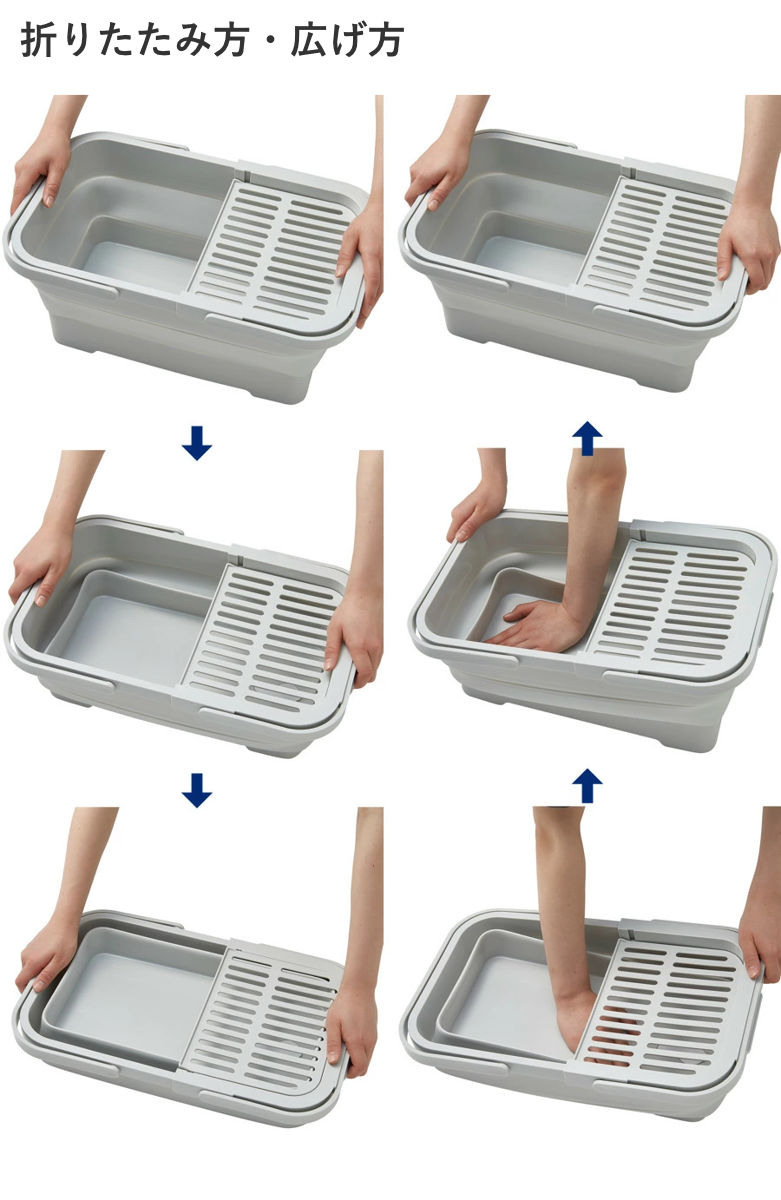 たたむ際は両ふちを持ち、同時に押し下げるとコンパクトにたためます。広げる際は底を押さえながら、左右の取っ手を交互に引きあげるだけなので簡単。いつでも手軽に使うことができます。