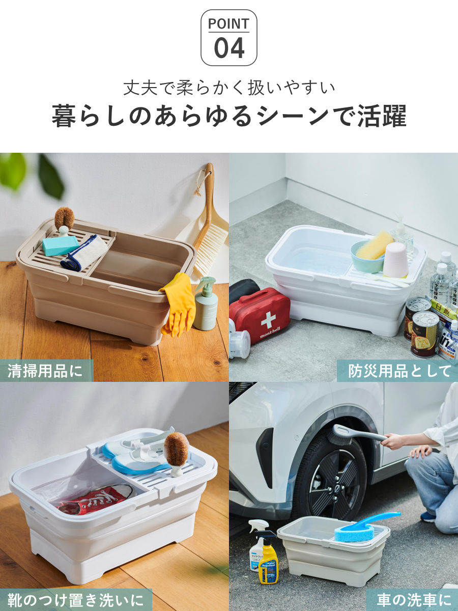 手洗いやつけ置き洗いはもちろん、清掃時のバケツ代わりや緊急時の食器洗い、車の洗車など、暮らしのさまざまな場面で活躍します。丈夫で柔らかい素材なので扱いやすく、用途に合わせて自由に使える万能アイテムです。また、アウトドアでドリンクを冷やしたり、キャンプの食器洗い用に使うのもおすすめです。