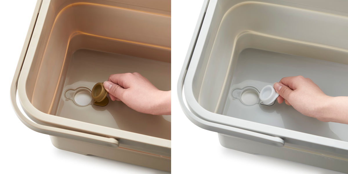 底の栓を外すことで簡単に水抜きが行えます。中身は入ったままで水だけ抜きたい時や、ほったらかしにしていても水抜きができるので便利です。また、片側だけ折りたたんで高さを低くすることで、水を一気に捨てることができます。