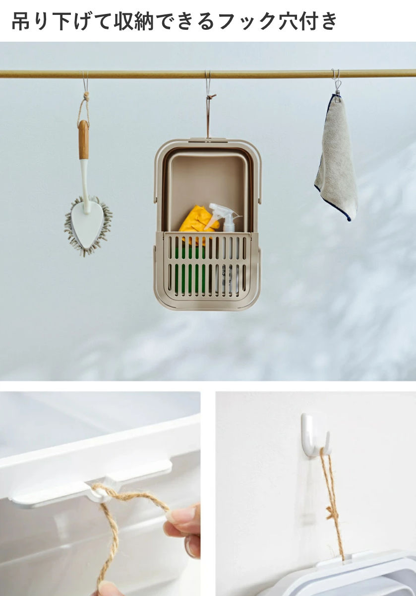 バケツにはフックを掛けられる穴が付いており、吊り下げてスッキリ収納できます。使いたいときにサッと手に取れる、便利な収納スタイルです。