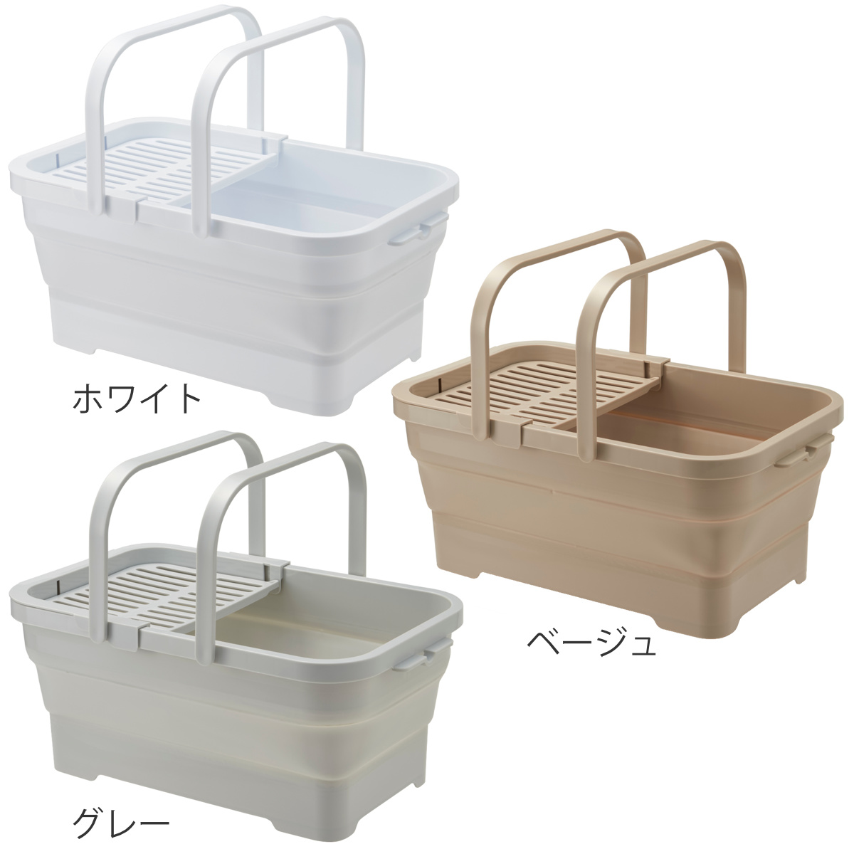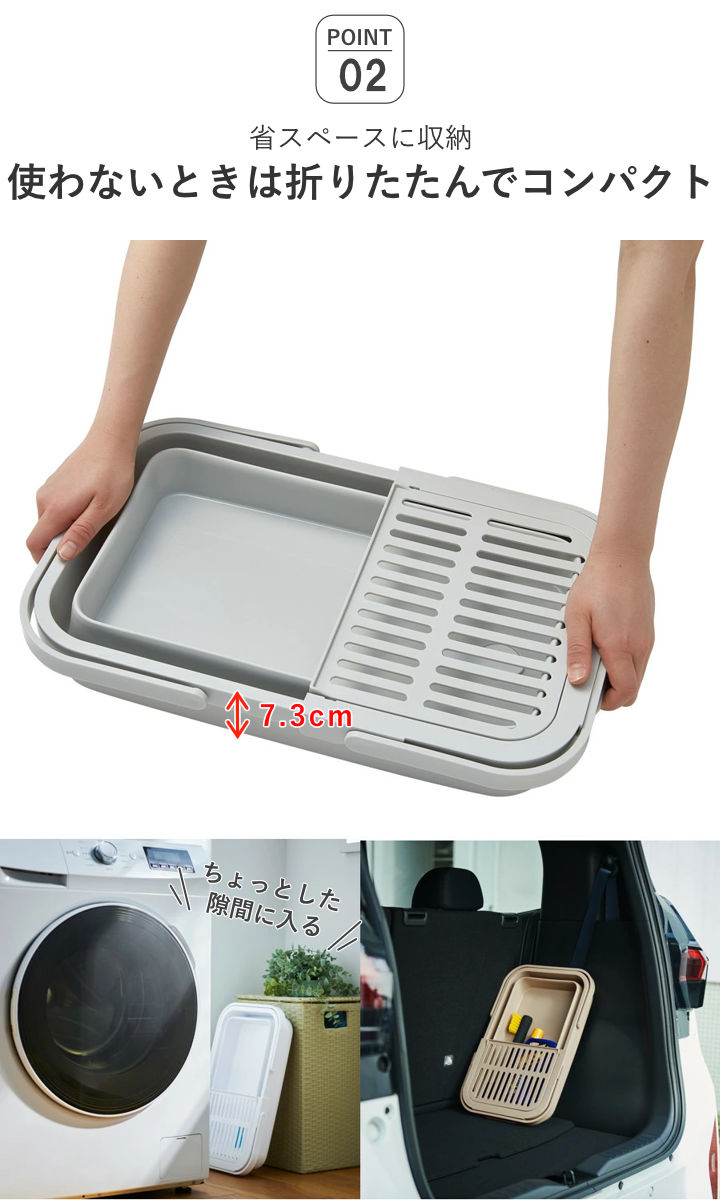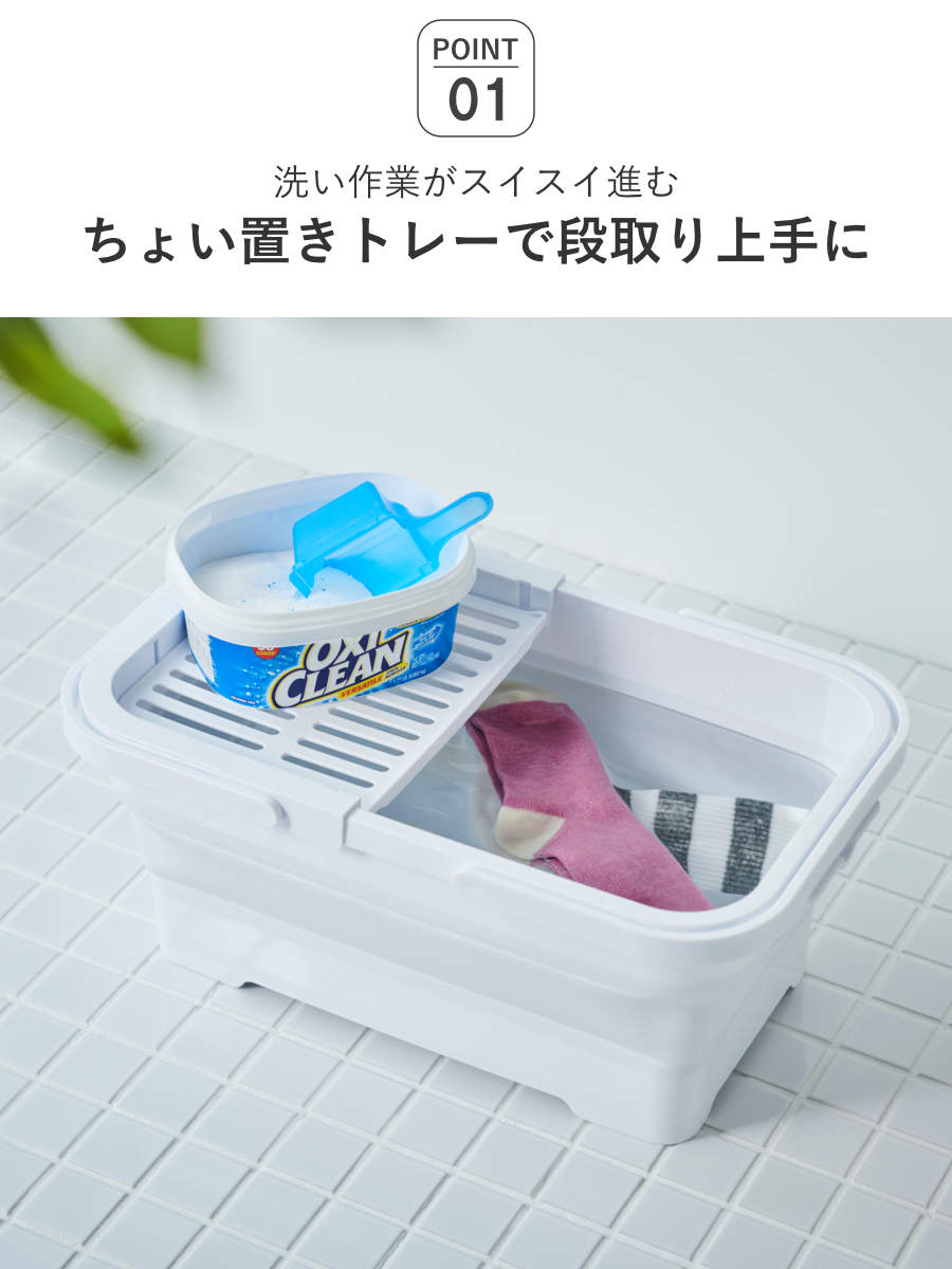 手洗いやつけ置き洗いに便利な折りたためるソフトタブです。取り外し可能な「ちょい置きトレー」付きで、洗剤やブラシを置いたり、洗ったものの一時置きに大活躍します。トレーは脱着式です。