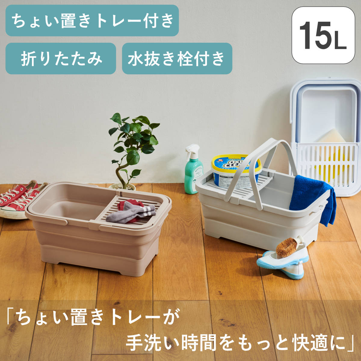 バスケット バケツ 折りたたみ 15L ちょい置きトレー付 ソフトバケツ ( 折りたたみバケツ 15リットル たためる 角型 掃除 漬け置き トレー 水切り 日本製 水抜き栓 清掃 おりたたみ コンパクト スリム 洗濯 ) 【グレー】
