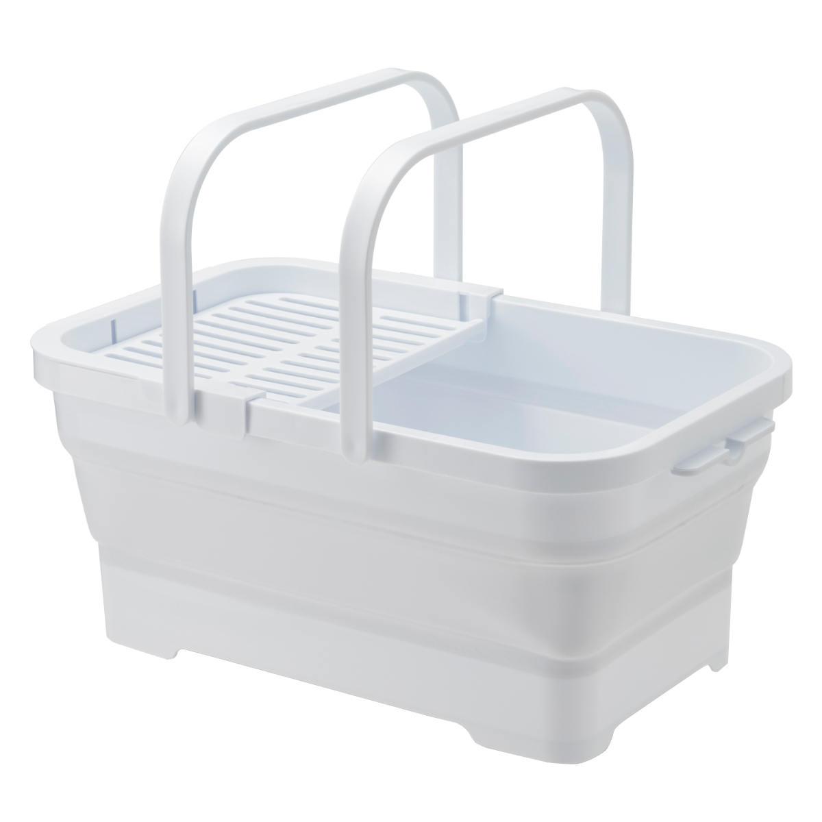 手洗いやつけ置き洗いに便利な折りたためるソフトタブです。取り外し可能な「ちょい置きトレー」付きで、洗剤やブラシを置いたり、洗ったものの一時置きに大活躍します。トレーは脱着式です。