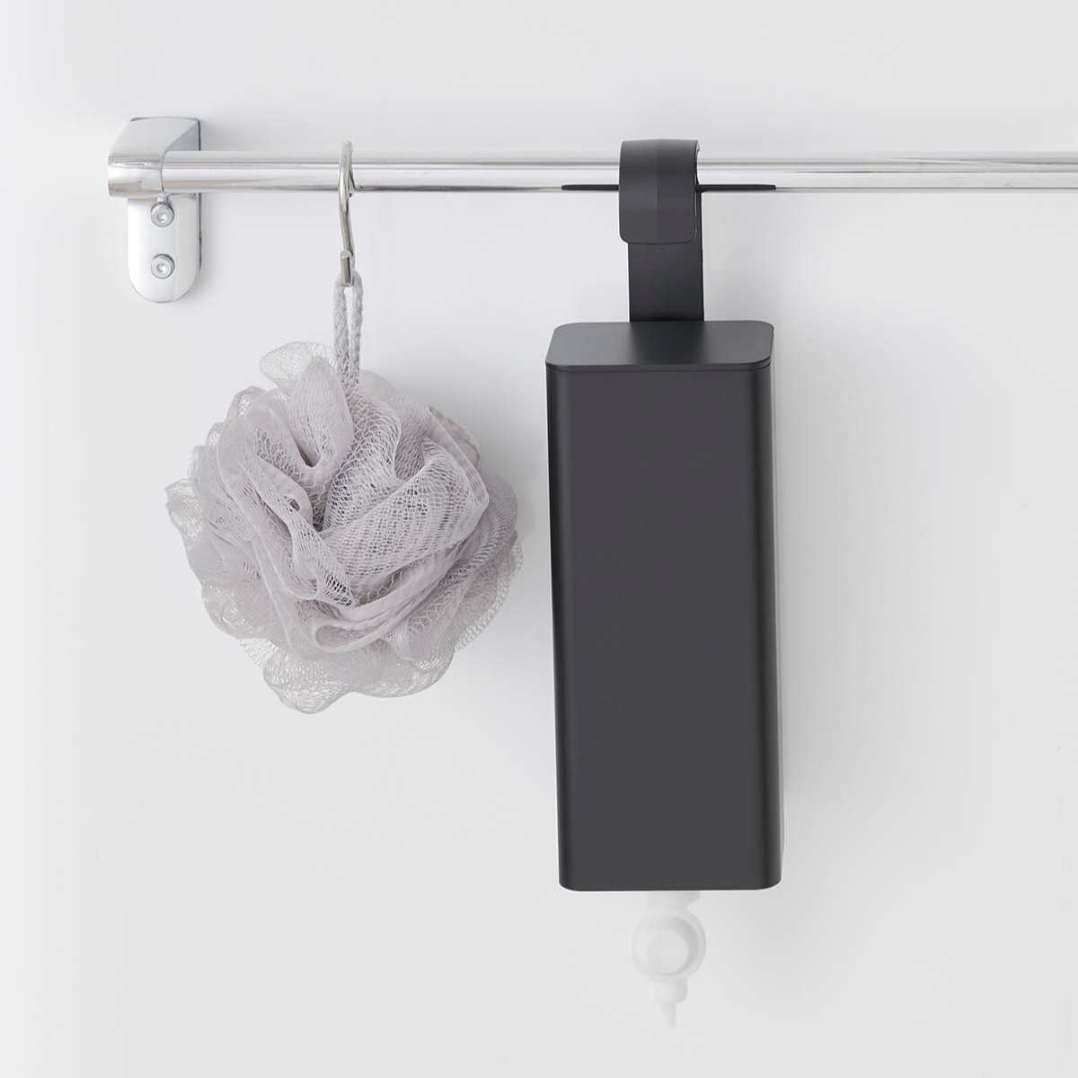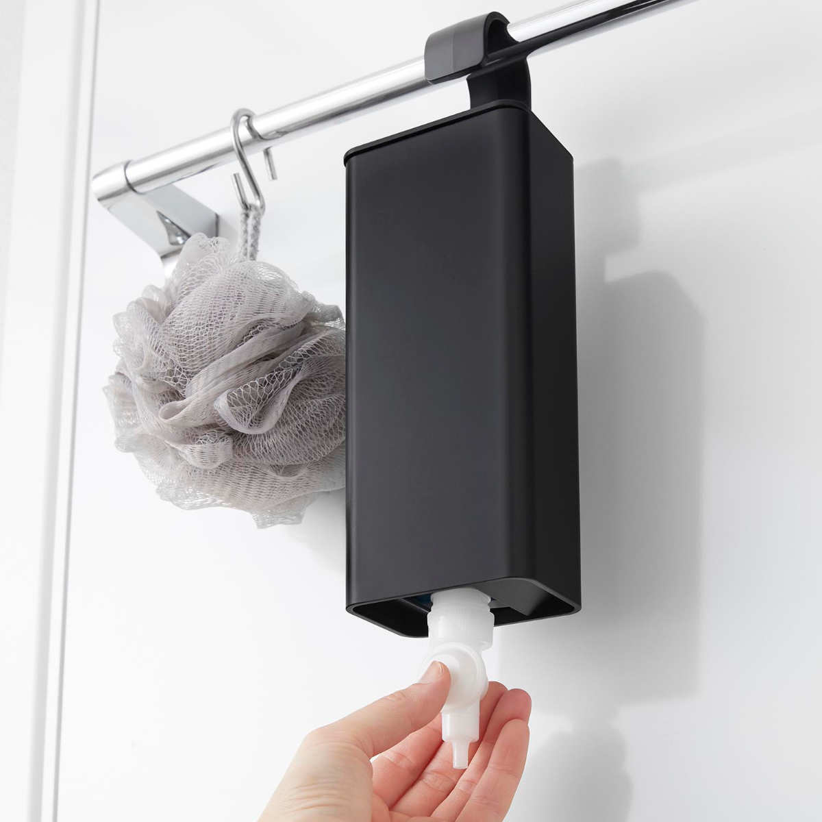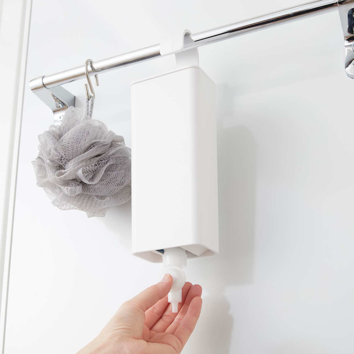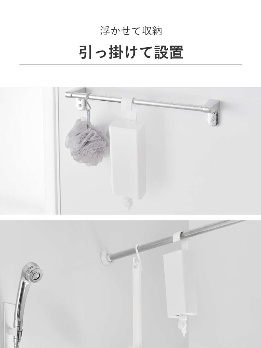 フックで浴室乾燥バーや洗面所のタオルバーに引っ掛けて設置することができます。浮かせて収納することでボトル底がぬめらず衛生的です。
