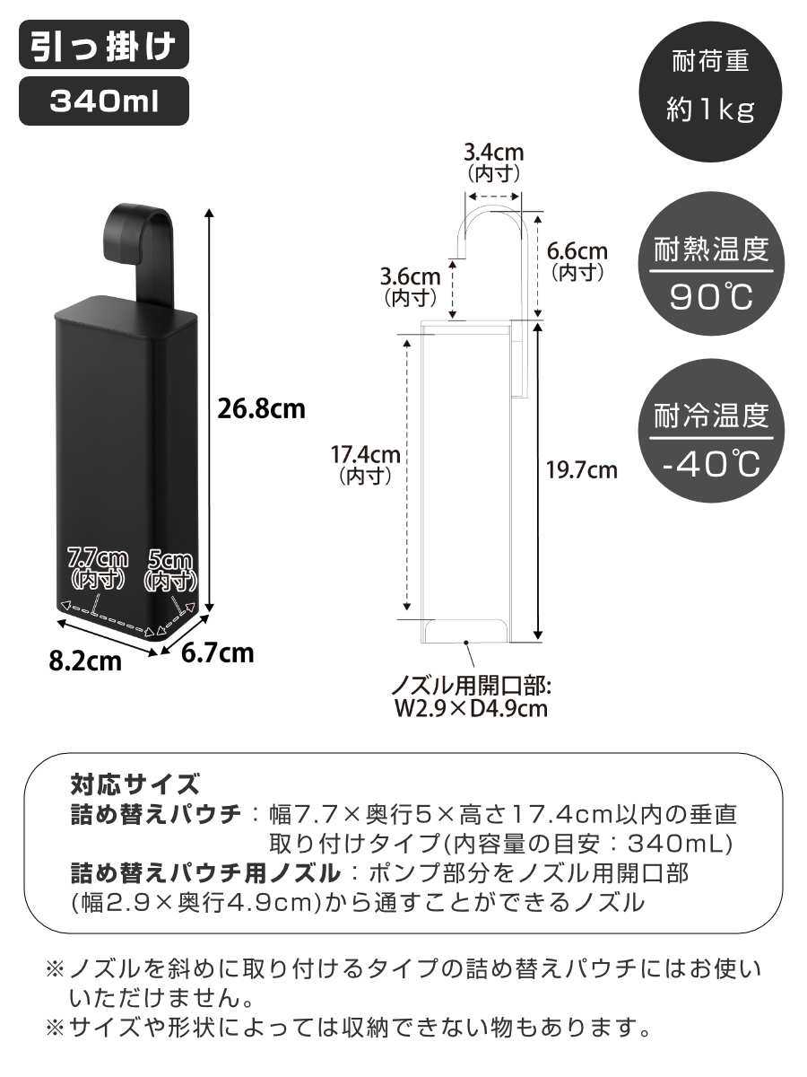| 対応サイズ | 詰め替えパウチ:幅7.7×奥行5×高さ17.4cm以内の垂直取り付けタイプ(内容量の目安:340mL) 詰め替えパウチ用ノズル:ポンプ部分をノズル用開口部(幅2.9×奥行4.9cm)から通すことができるノズル ※ノズルを斜めに取り付けるタイプの詰め替えパウチにはお使いいただけません。 ※サイズや形状によっては収納できない物もあります。 |