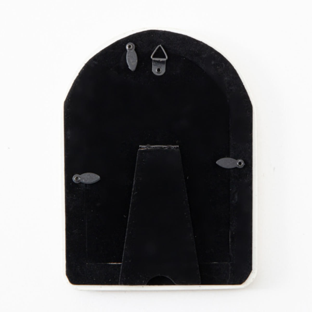 フォトスタンドとして立てて置くだけでなく、壁掛け用フックが付いているので壁にも取り付けられます。