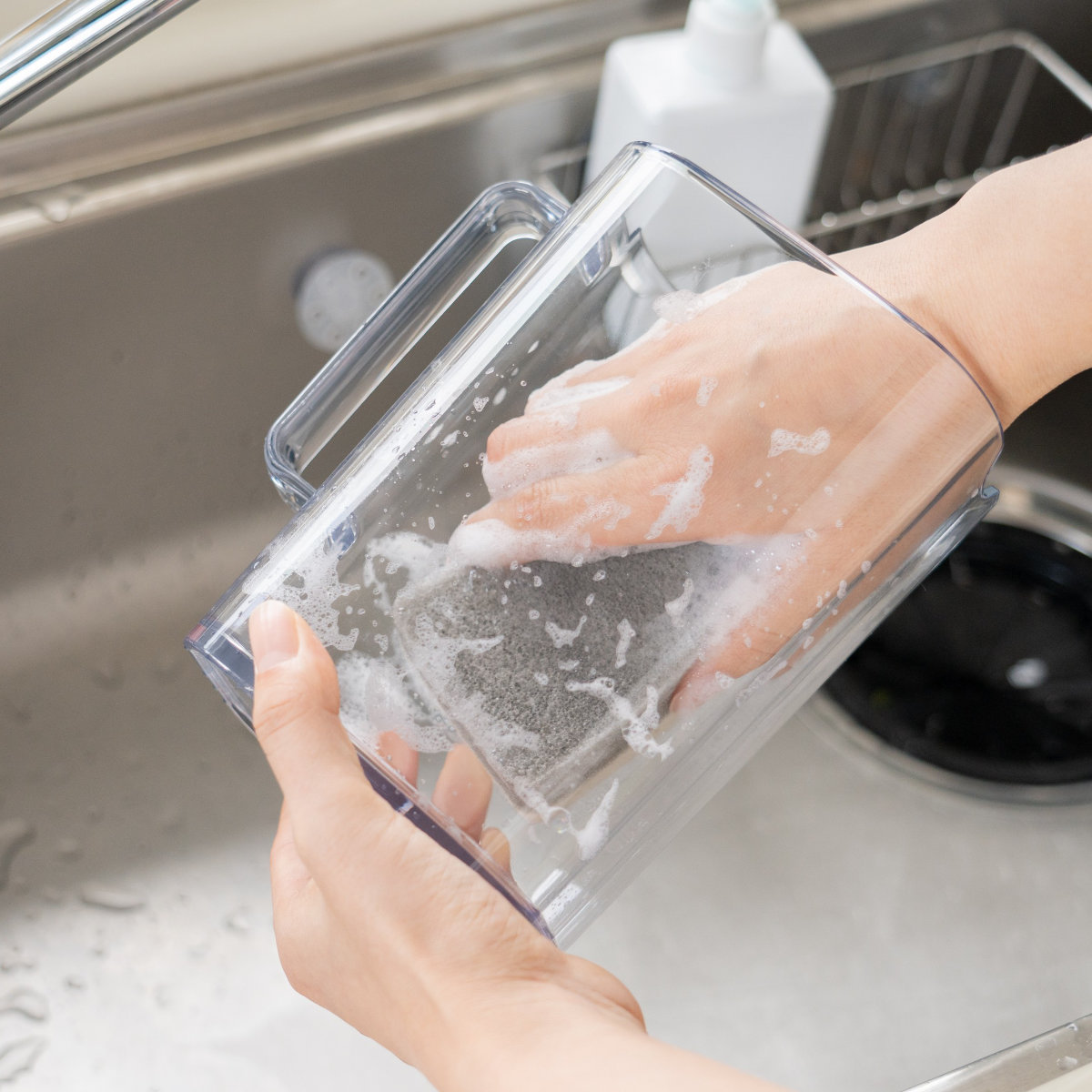 広口設計なので、ボトルの中まで手を入れてしっかり洗えます。フタは取り外して洗うことができるので、清潔を保てて衛生的にお使いいただけます。