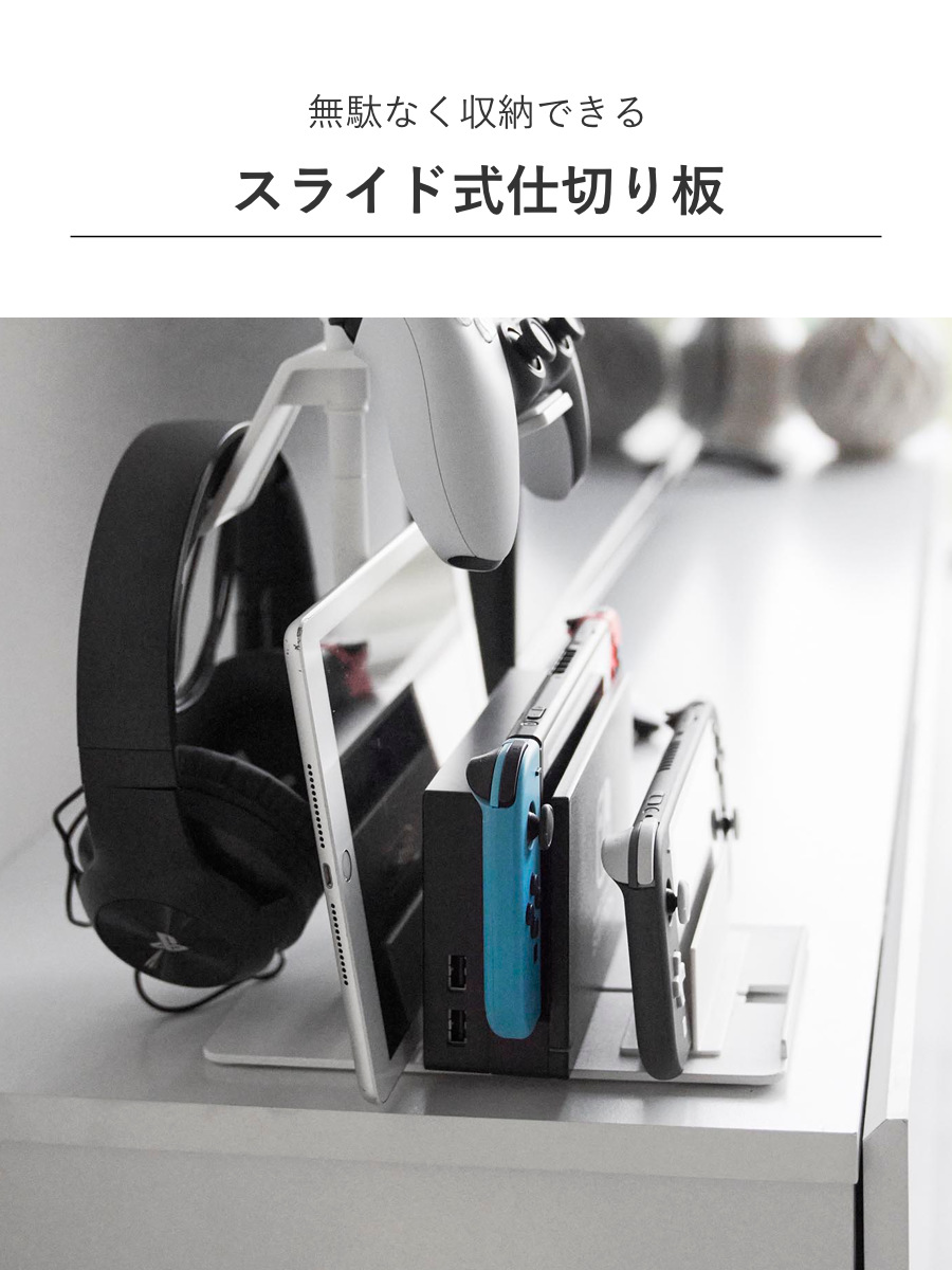 仕切り板はスライドさせて動くので、厚みのある充電ドックや小型ゲーム機、タブレットやスマホなどを無駄なく立てて収納することができます。