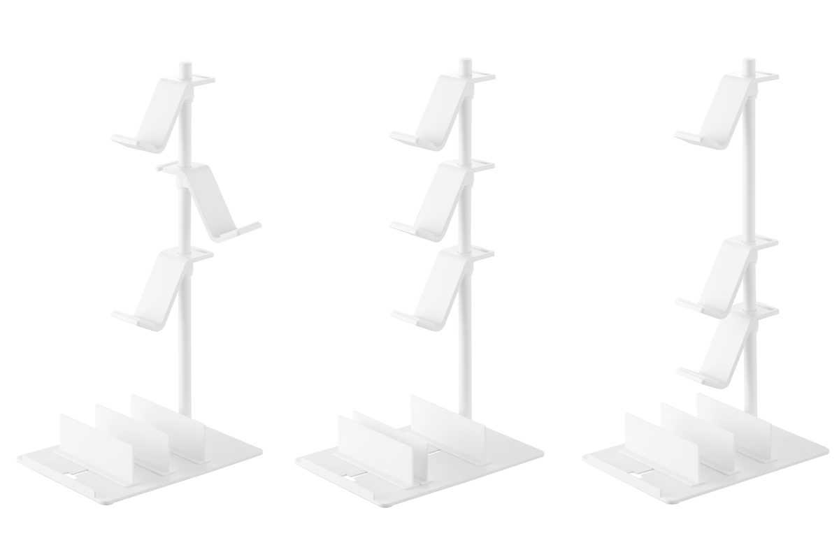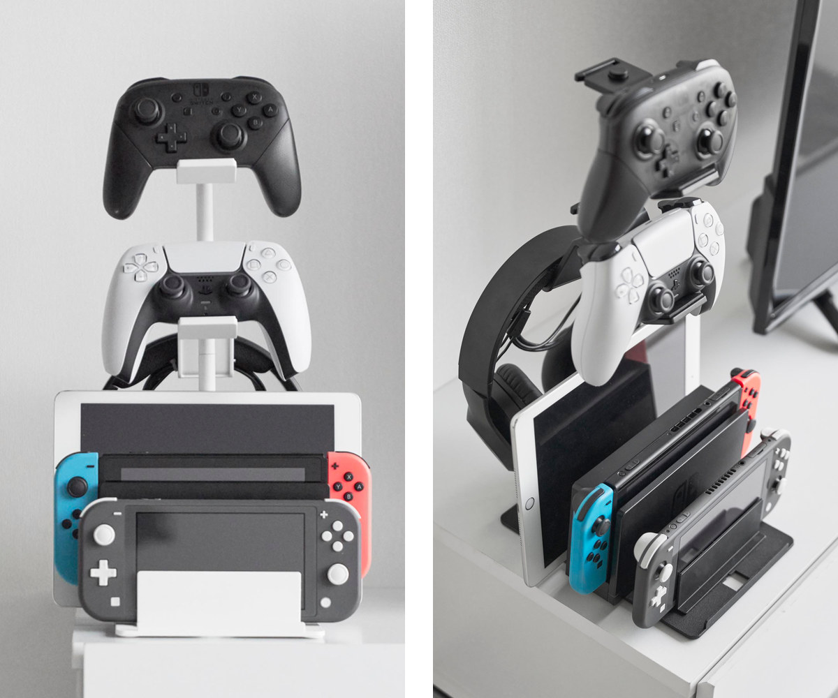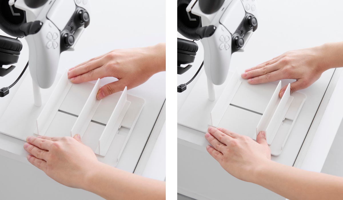 3つあるコントローラー置き台は、高さと向きの調節が可能です。2つは正面に向けてコントローラーを置いて、1つは背面に向けてヘッドホンを置いたり、収納している物に合わせたり、手に取りやすい位置で使えます。