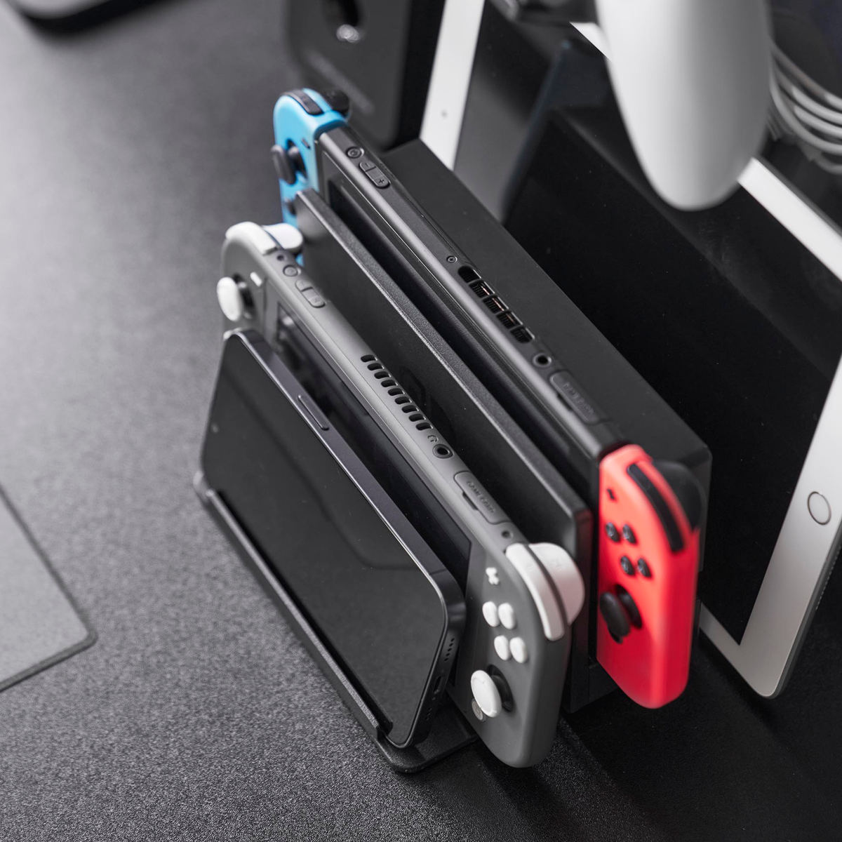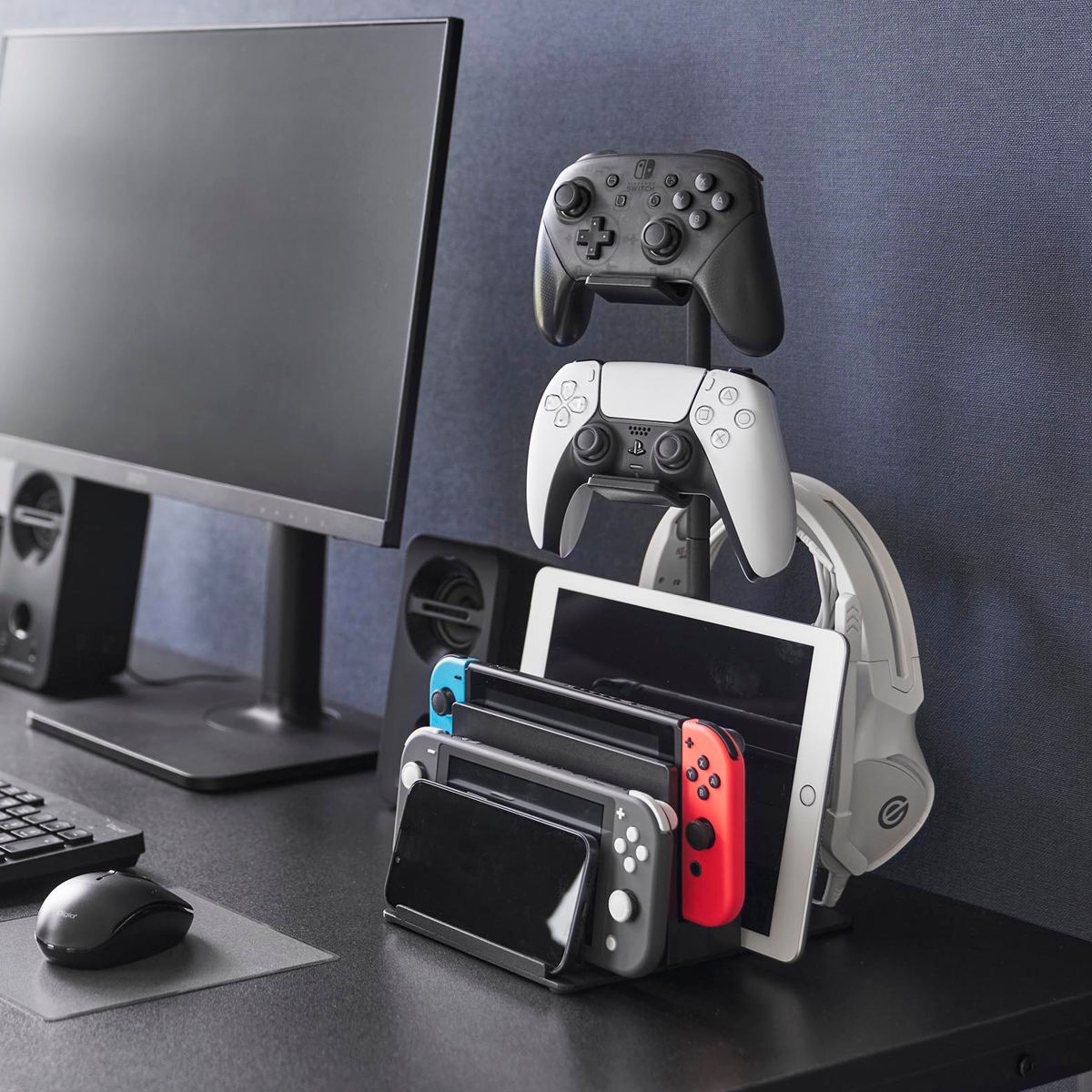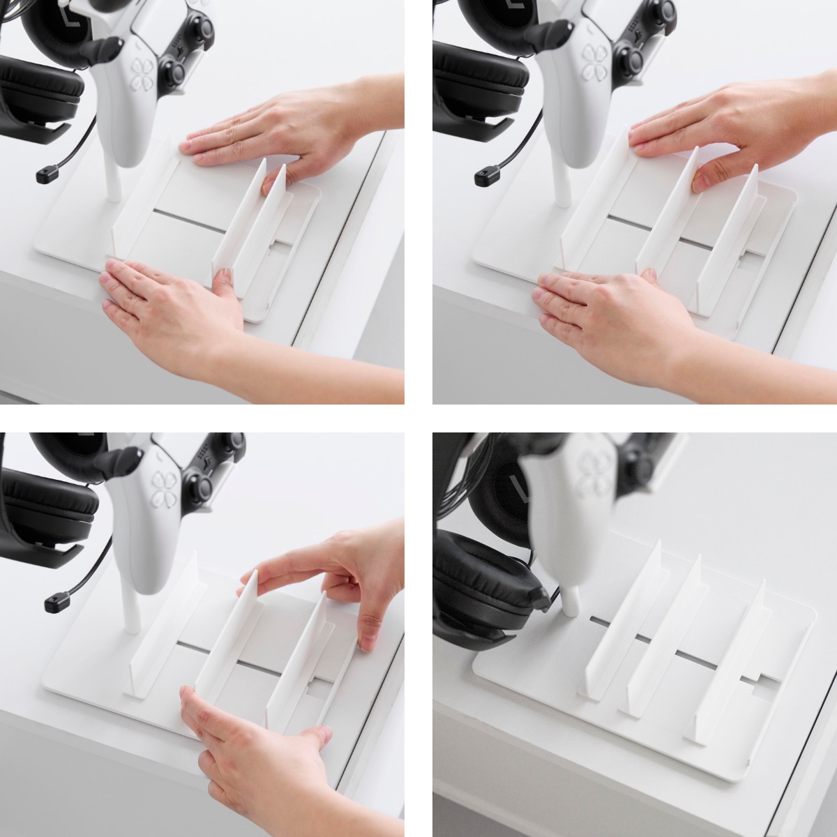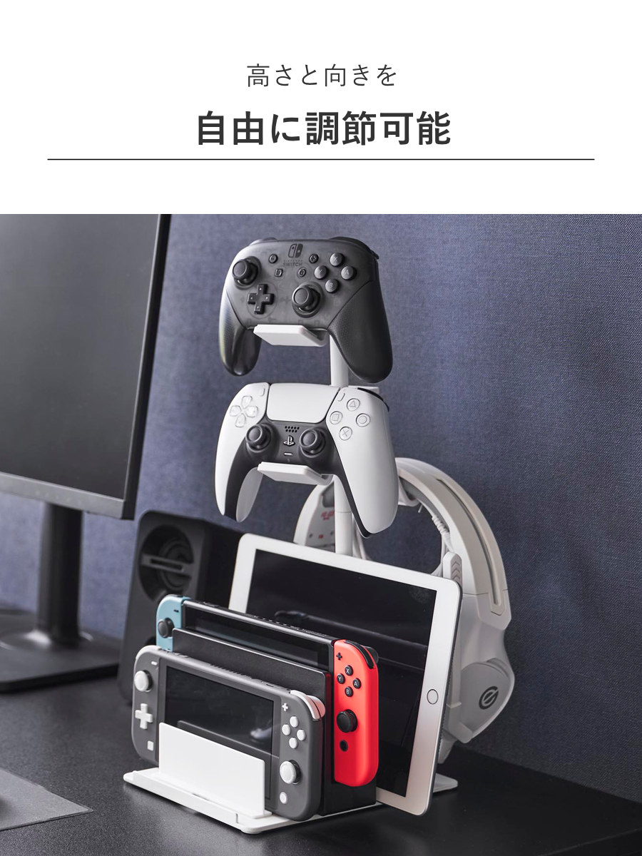 3つあるコントローラー置き台は、高さと向きの調節が可能です。2つは正面に向けてコントローラーを置いて、1つは背面に向けてヘッドホンを置いたり、収納している物に合わせたり、手に取りやすい位置で使えます。