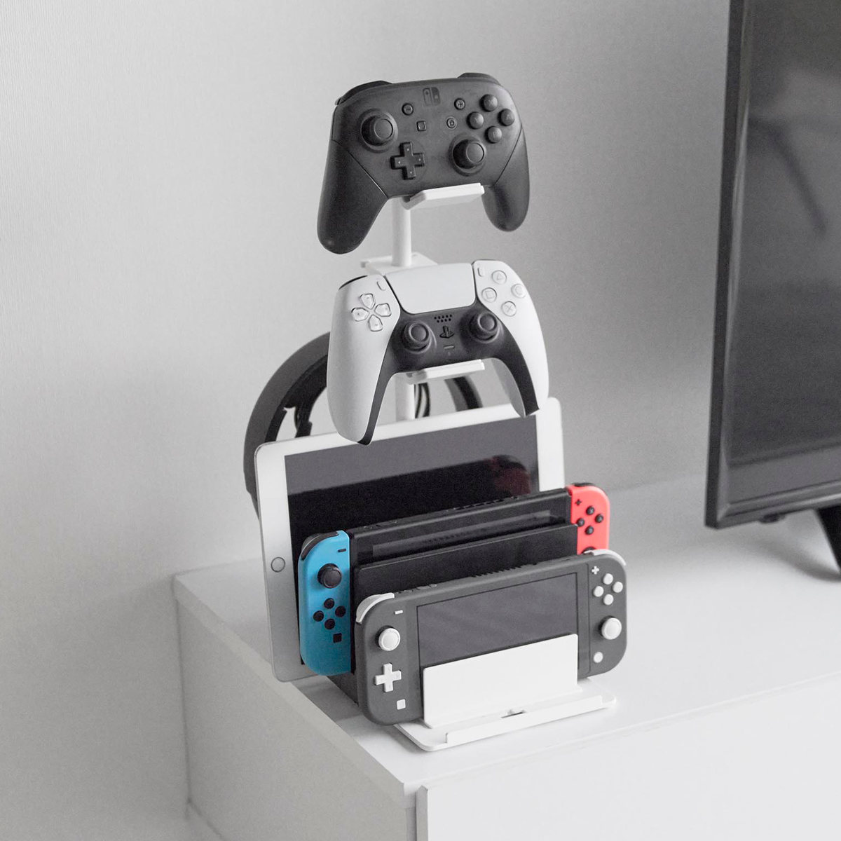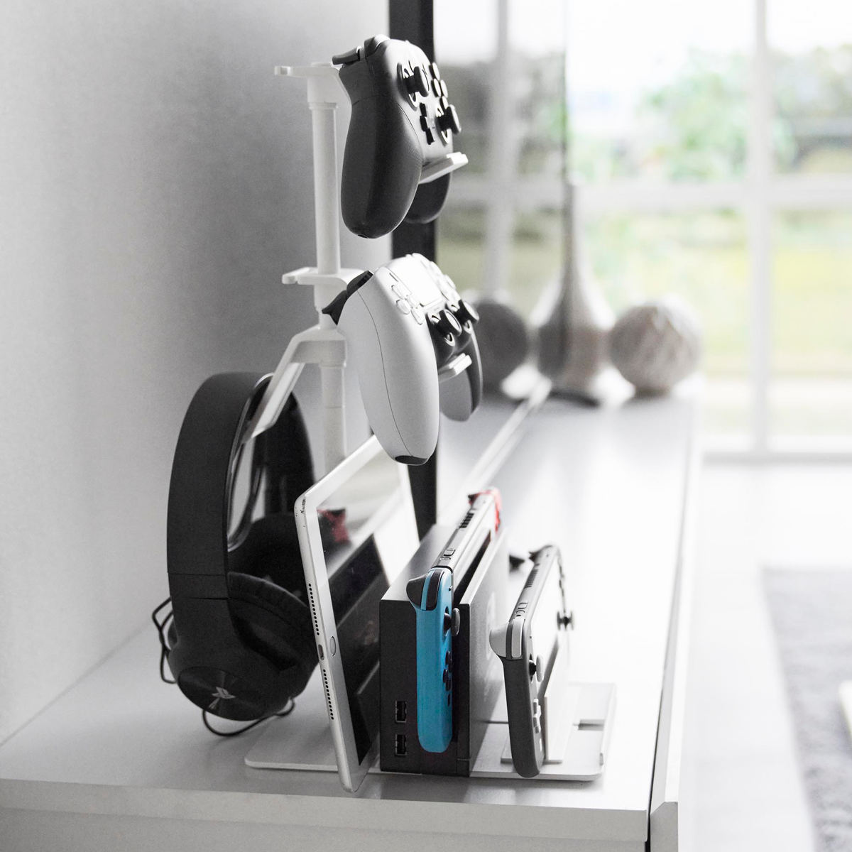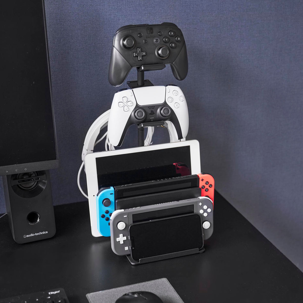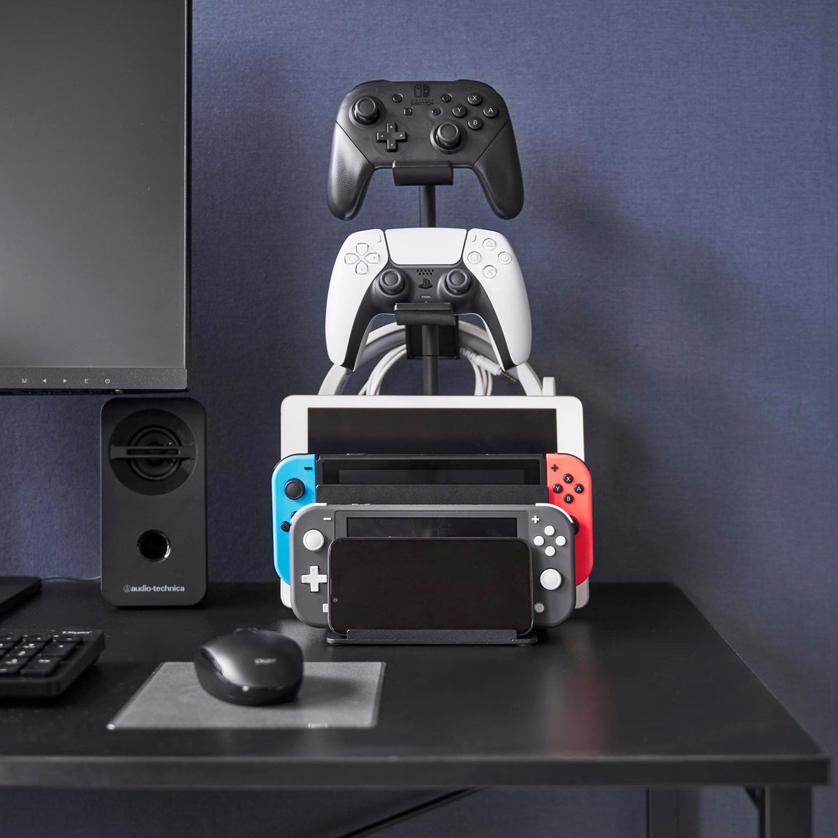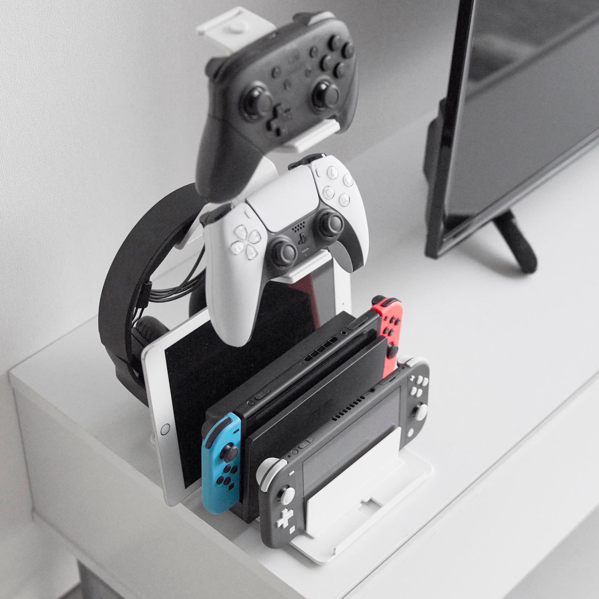 3つあるコントローラー置き台は、高さと向きの調節が可能です。2つは正面に向けてコントローラーを置いて、1つは背面に向けてヘッドホンを置いたり、収納している物に合わせたり、手に取りやすい位置で使えます。