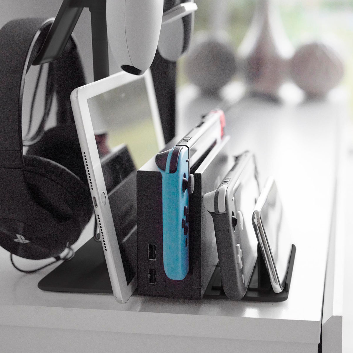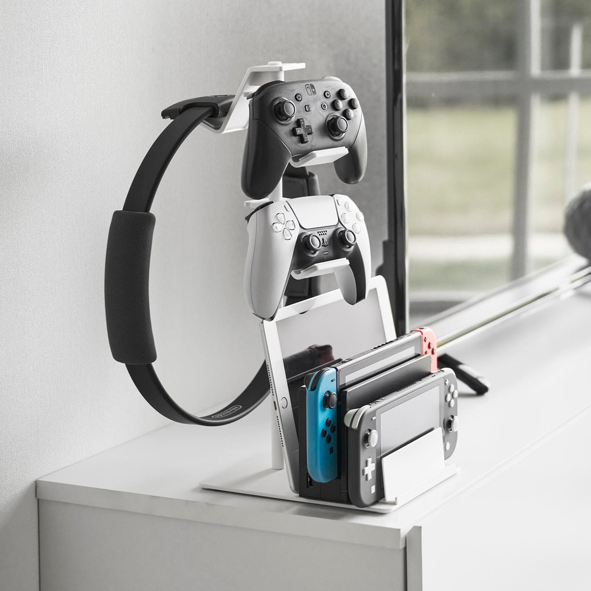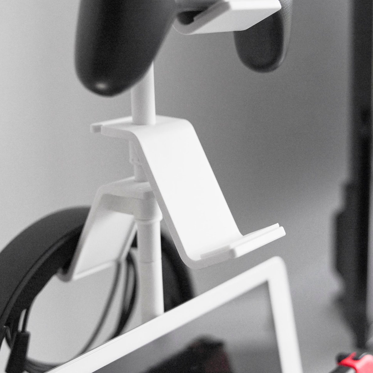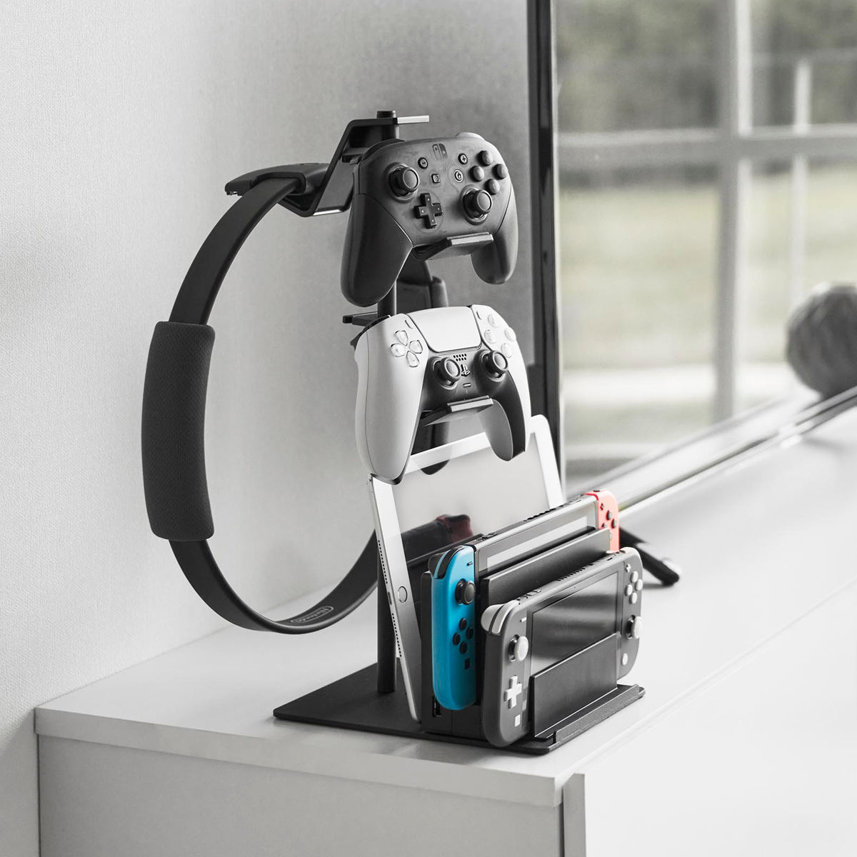 3つあるコントローラー置き台は、高さと向きの調節が可能です。2つは正面に向けてコントローラーを置いて、1つは背面に向けてヘッドホンを置いたり、収納している物に合わせたり、手に取りやすい位置で使えます。