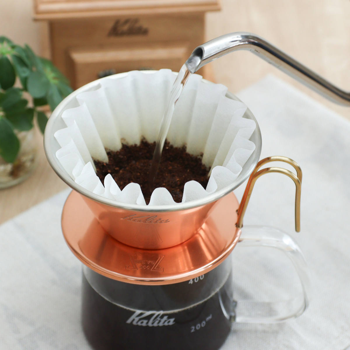 専用のウェーブフィルター(別売り)を使用すると、ドリッパーとの接触面が少なく、長時間フィルター内のかたよったところにお湯がたまらず、速やかにドリップされます。かたよってお湯を注いでも、底が平らなので粉に均一になじみやすいのが特徴です。「ウェーブ」シリーズは初心者からプロのバリスタまで…誰もが手軽に、ベストな味わいをお楽しみいただけるKalitaオリジナルのプロダクトシリーズです。