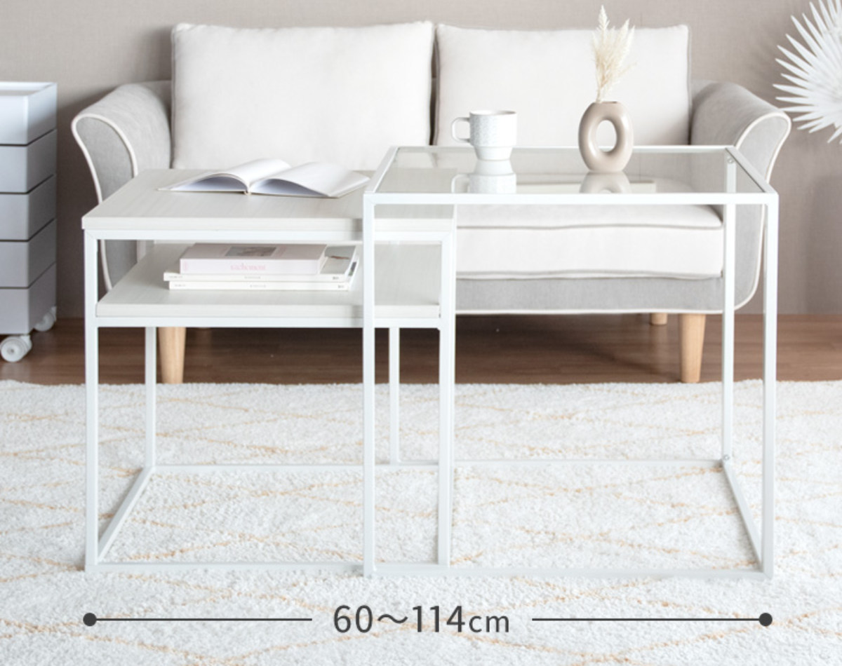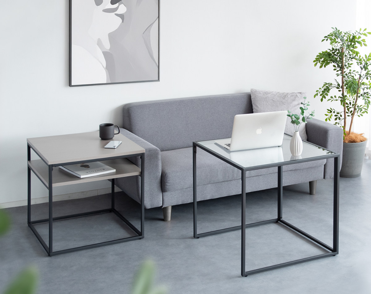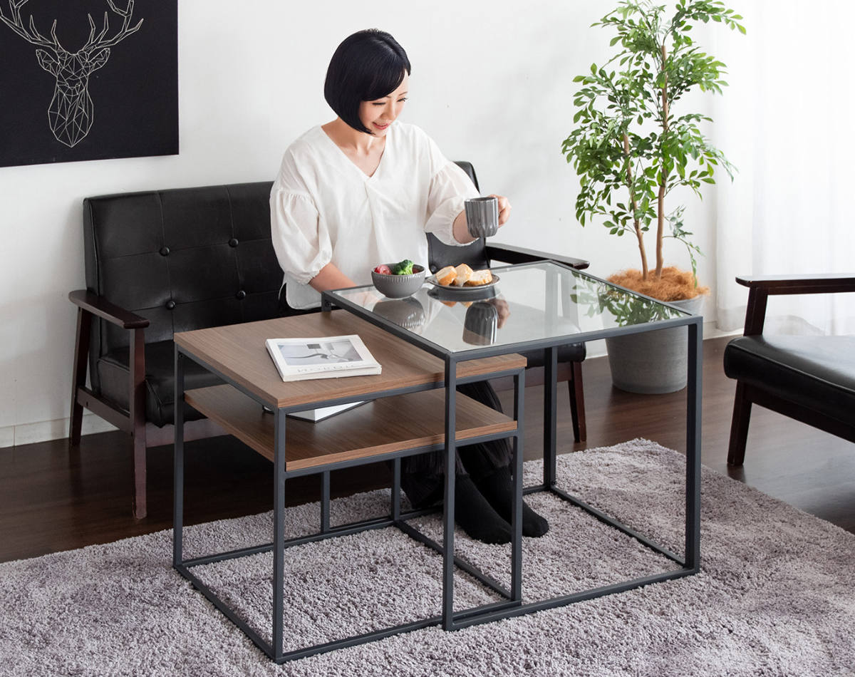 ガラス天板のテーブルと棚付き木製テーブルは、切り離して独立したテーブルとして使ったり、サイドテーブルとして使ったりと自由なレイアウトが可能です。