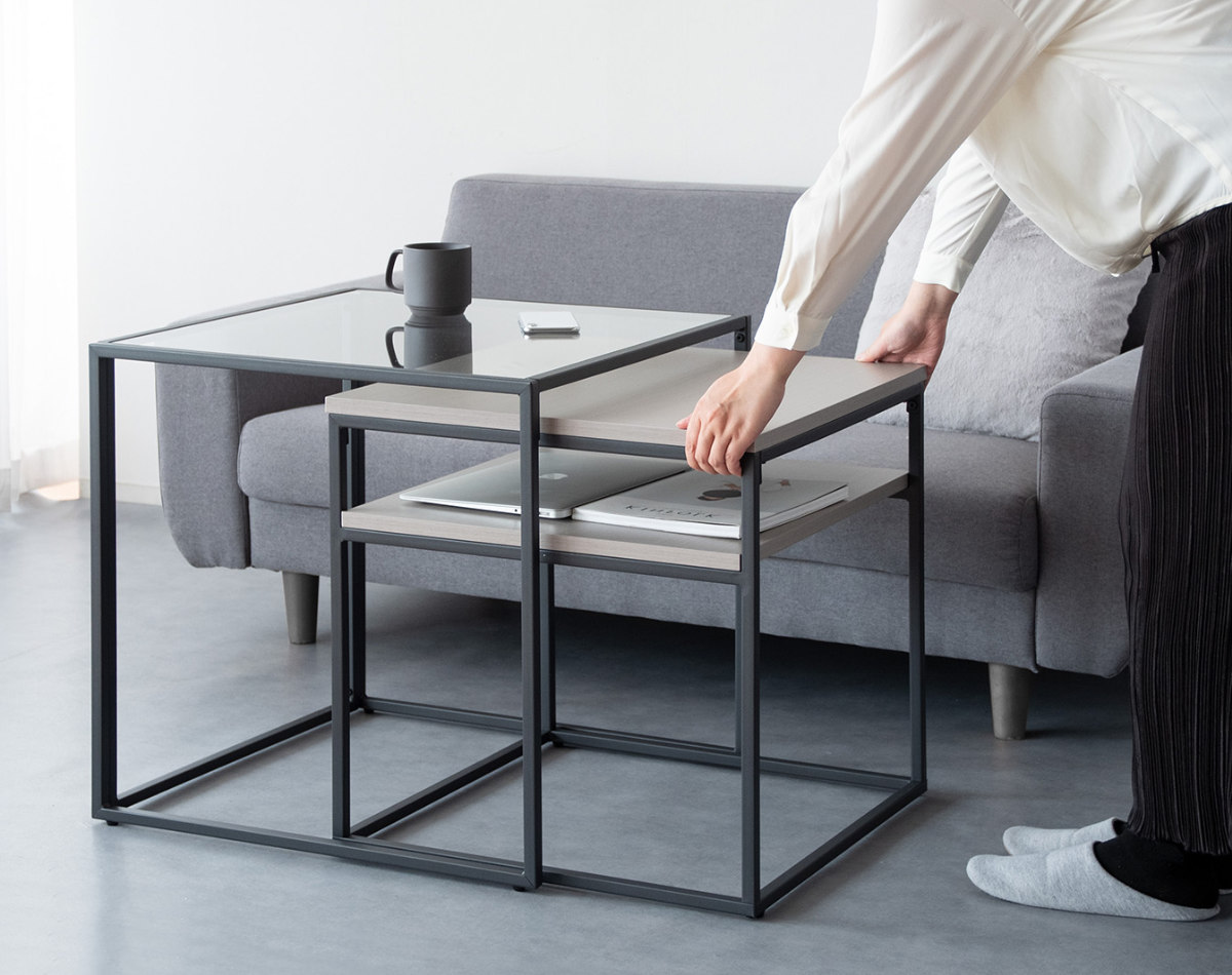 入れ子式のネストテーブルなので、テーブルを引き出すだけで使いたい幅に広げられて簡単です。来客時などにもサッと対応でき、テーブル広さが不要な時はすっぽり重ねるなど、シーンに合わせたアレンジができます。