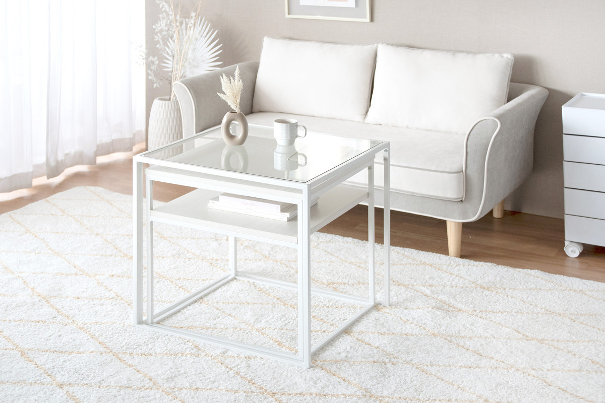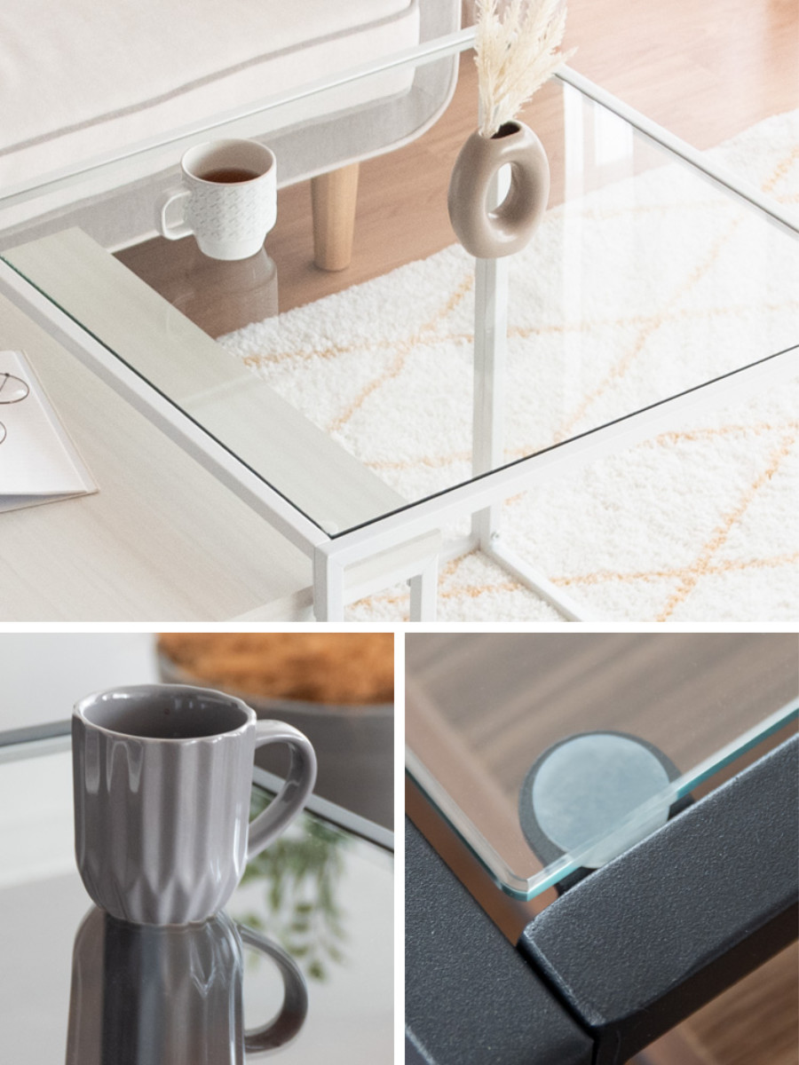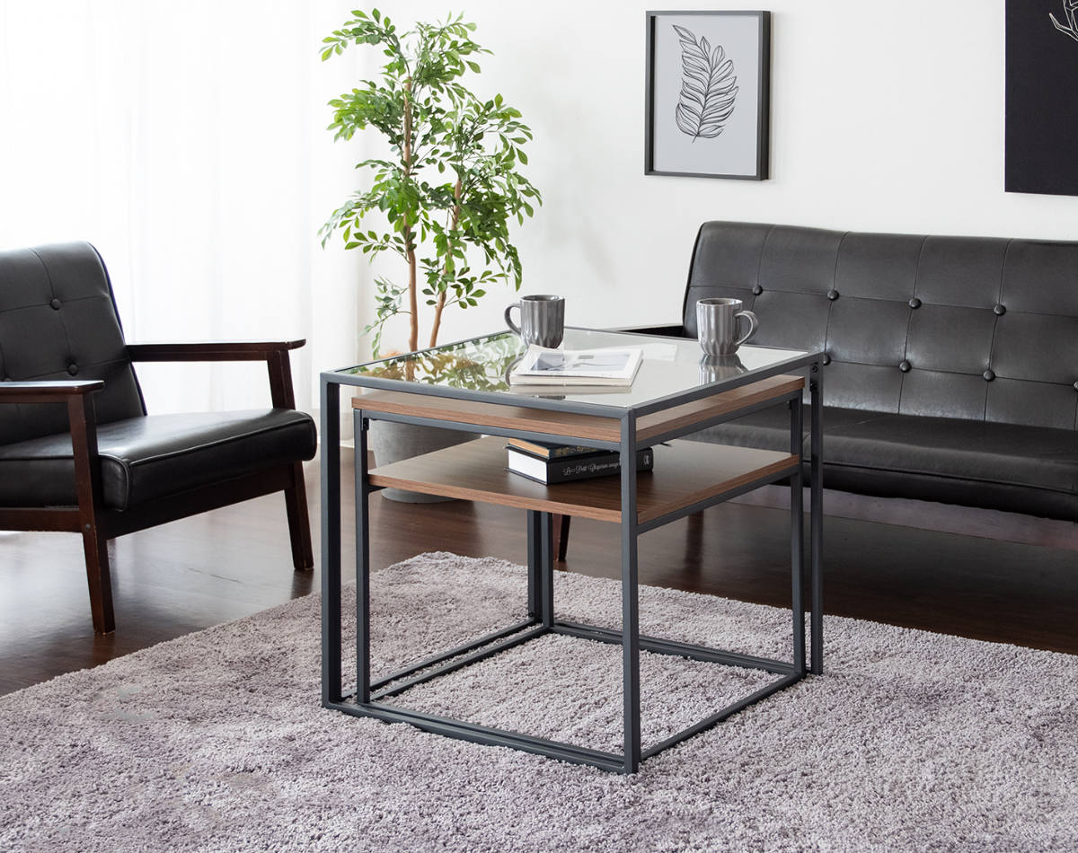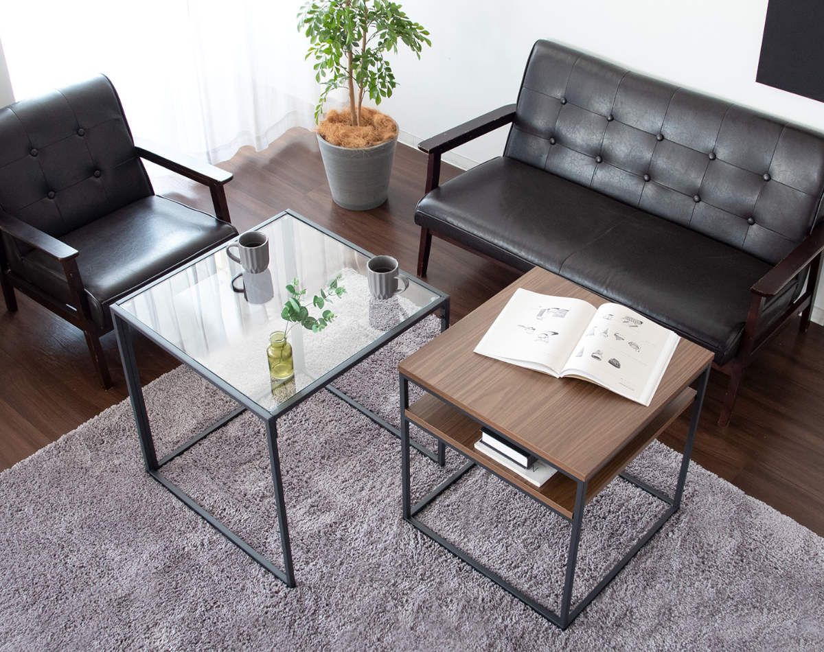 コンパクトなサイズ感とスタイリッシュなスクエアフォルムが印象的なセンターテーブルです。透明な美しいガラス・温かみのある木目・スチールの異素材ミックスデザインが、高級感のある雰囲気を演出してくれます。