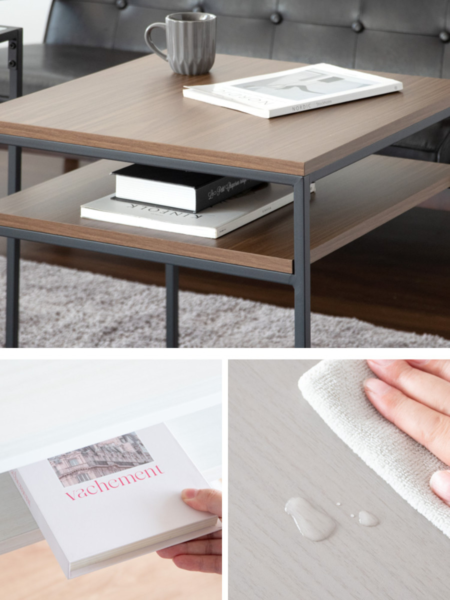 木目が美しい天板は、水や傷に強い合成樹脂合板を使用しています。天板下には雑誌やリモコンが収納できる棚が付いており、リビングに最適です。