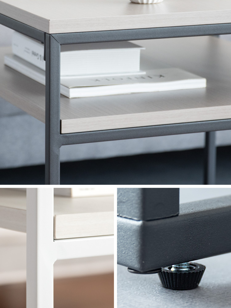 強度の高いスチール製のフレームが天板をしっかり支えます。床の凹凸や傾きによるガタつきを軽減するアジャスターが付いています。