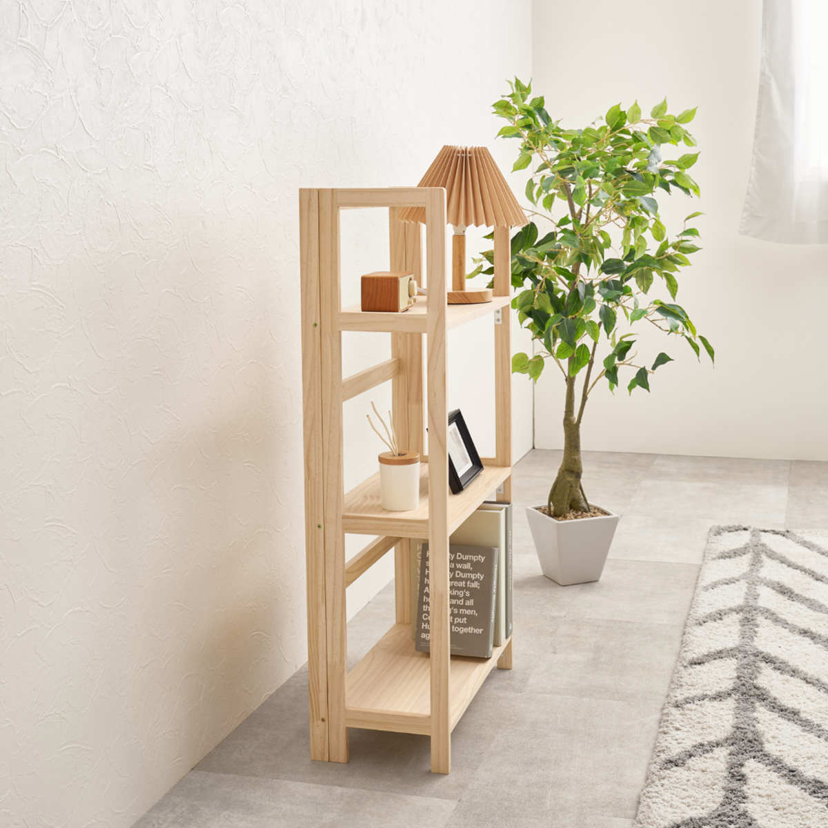 必要な時に、サッと広げてどこでもディスプレイできる折りたたみラックです。温かな木目が特長の天然木パイン材を使用しているので、経年による色味の変化をお楽しみいただけます。