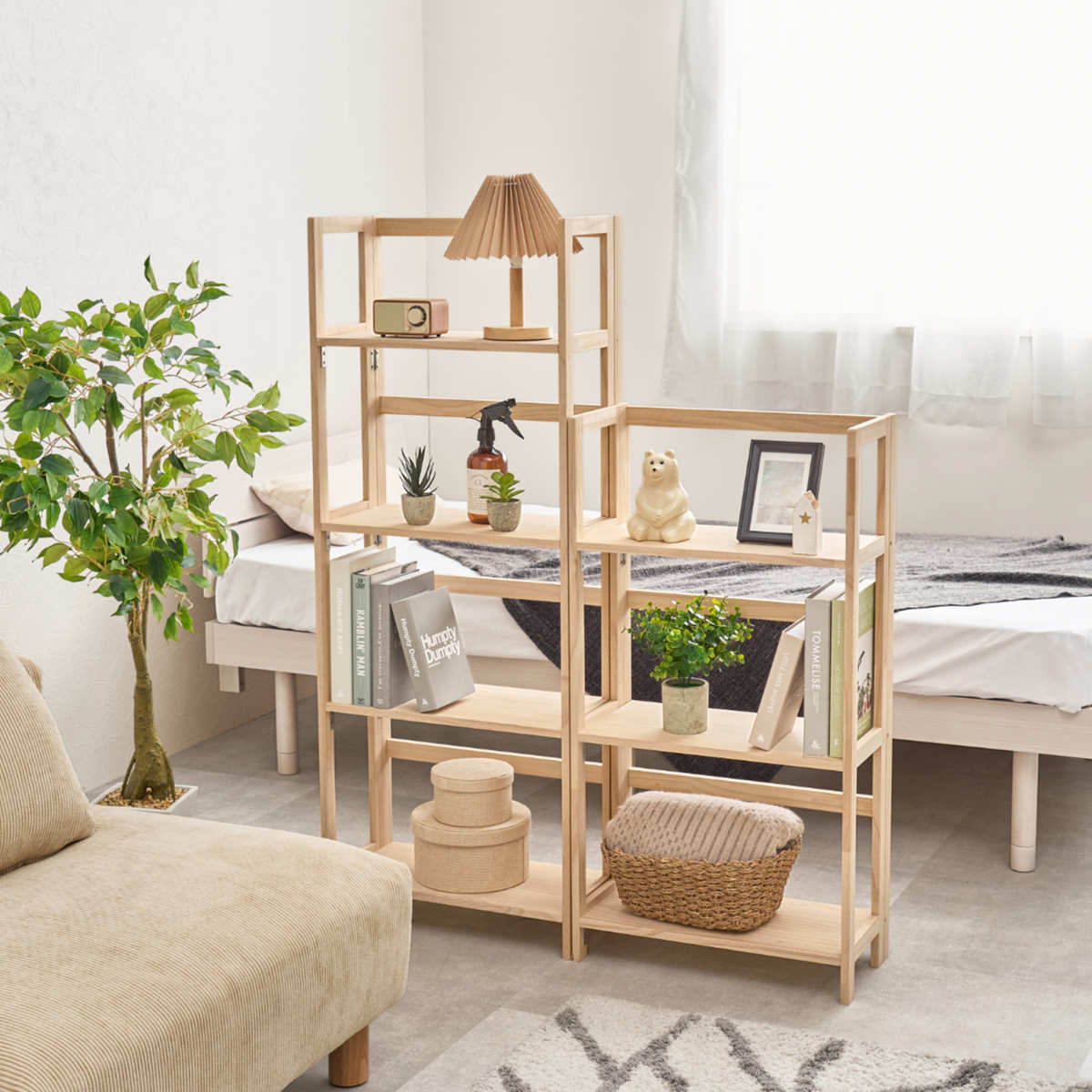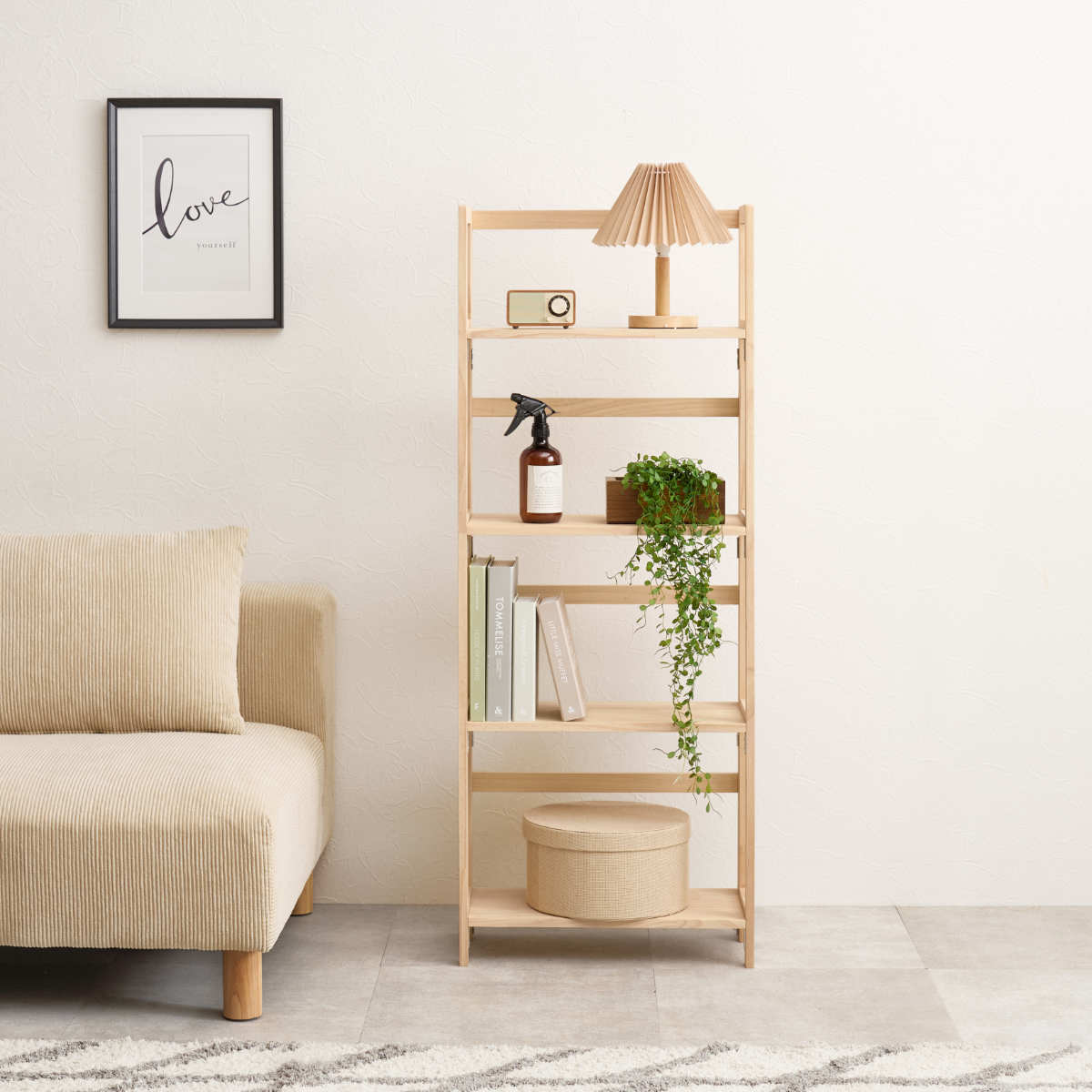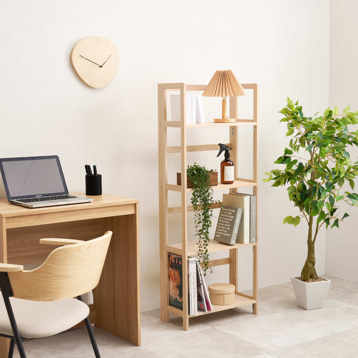 必要な時に、サッと広げてどこでもディスプレイできる折りたたみラックです。温かな木目が特長の天然木パイン材を使用しているので、経年による色味の変化をお楽しみいただけます。