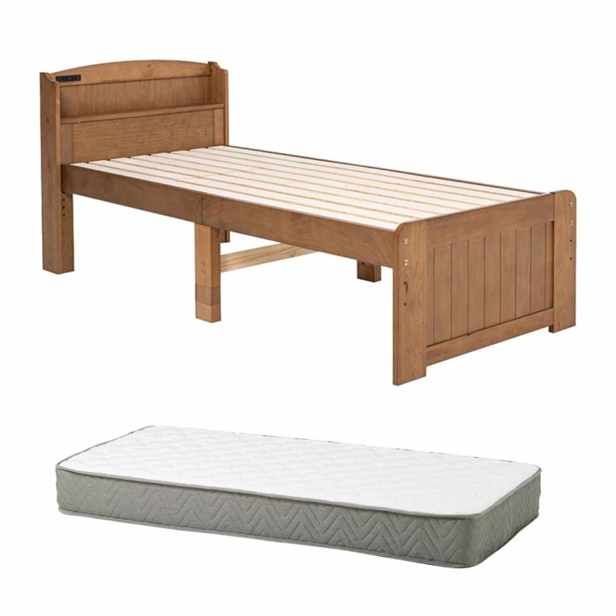 すのこベッド セミシングルショート ポケットマットレス付 宮棚 2口コンセント付 ( ベッド マットレス付 セミシングル ショート ポケットコイル 天然木 ベッドフレーム 厚さ20cm ライトブラウン ナチュラル ホワイトウォッシュ ) 【ライトブラウン】