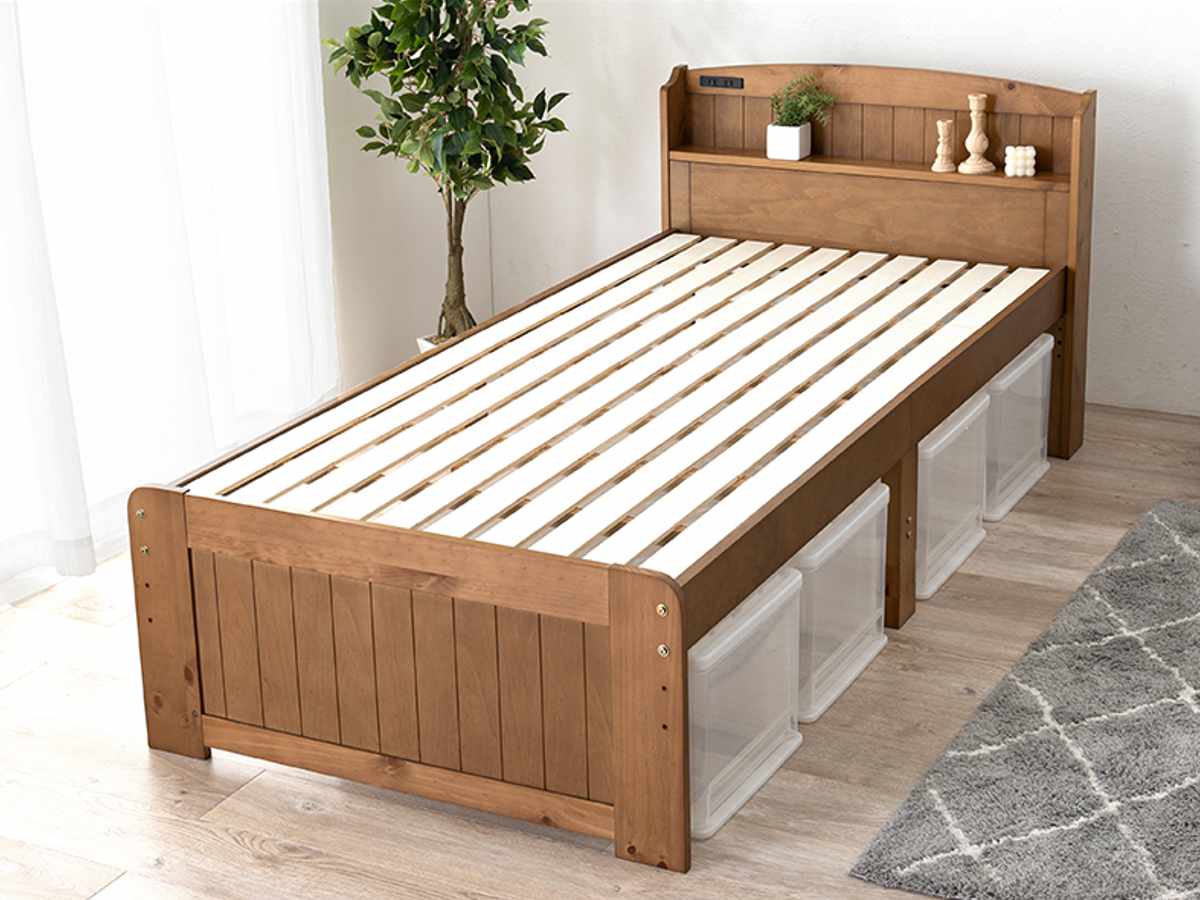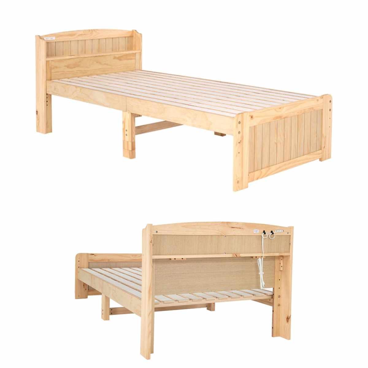 すのこベッド シングル ボンネルマットレス付 宮棚 2口コンセント付 ( ベッド マットレス付 セミシングル ショート ボンネルコイル 天然木 ベッドフレーム 厚さ14.5cm ライトブラウン ナチュラル ホワイトウォッシュ ) 【ナチュラル】