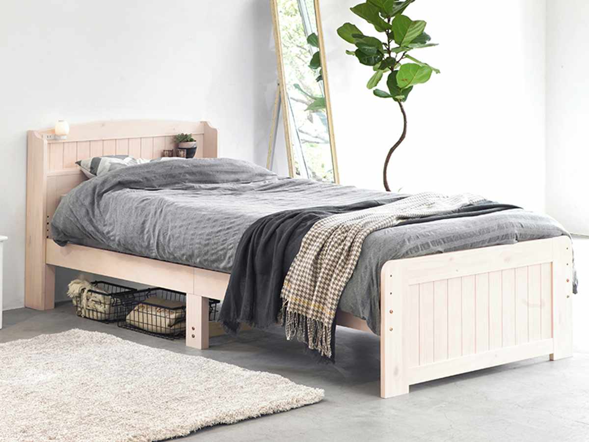 眼鏡や目覚まし時計などの小物を置くことができる宮棚付きです。棚には2口コンセントが付いているので、枕元でライトを灯しながら同時にスマホやタブレットを充電することができます。