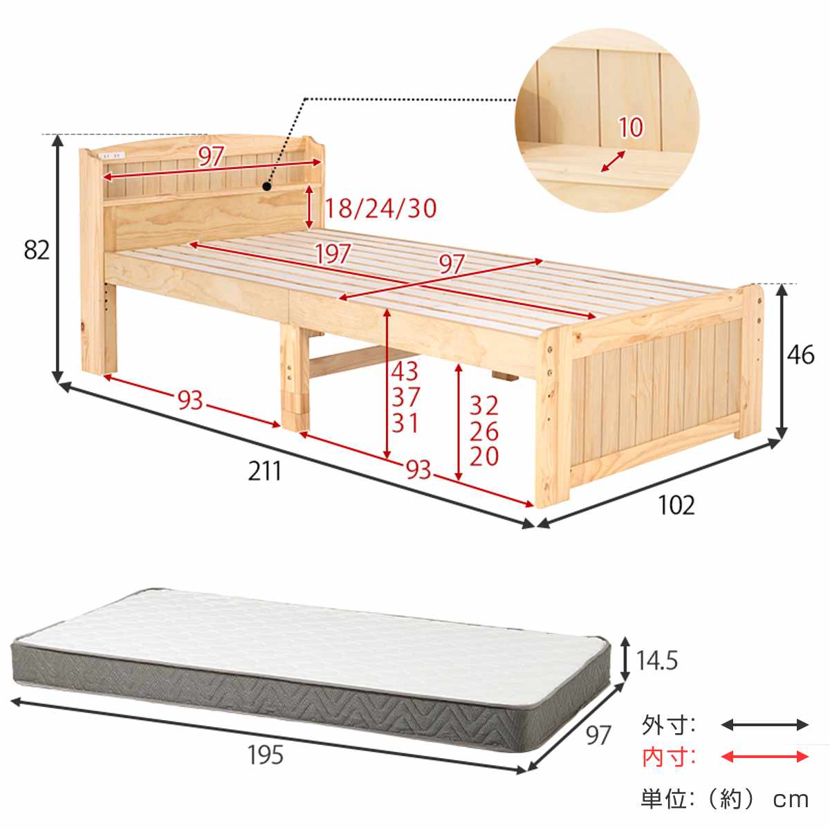 | サイズ | ベッド:約 幅102×奥行211×高さ82(cm) 床面高:31・37・43cmの3段階 マットレス:約 幅97×奥行195×高さ14.5(cm) |