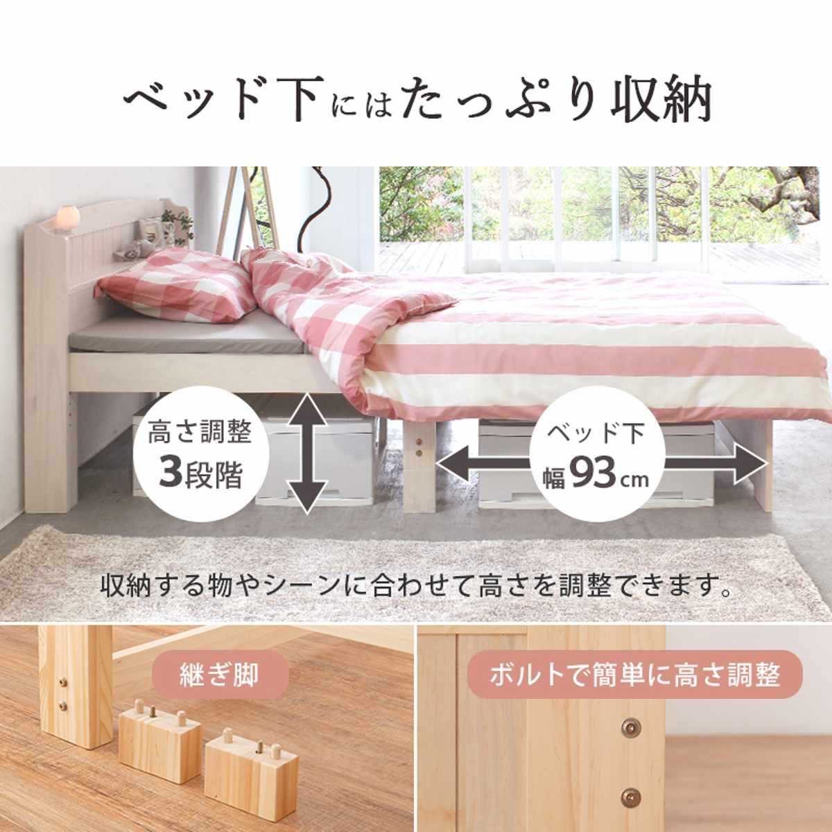 ベッド下は収納スペースとしてお使いいただけます。普段使いにも便利な収納ケースの他、布団や季節用品など、かさばるものや使用頻度の低い物の収納にもぴったりです。