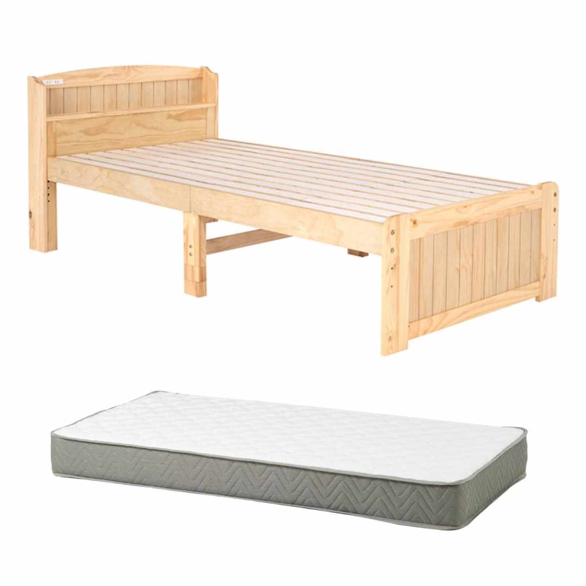 すのこベッド シングル ポケットマットレス付 宮棚 2口コンセント付 ( ベッド マットレス付 セミシングル ショート ポケットコイル 天然木 ベッドフレーム 厚さ20cm ライトブラウン ナチュラル ホワイトウォッシュ ) 【ナチュラル】