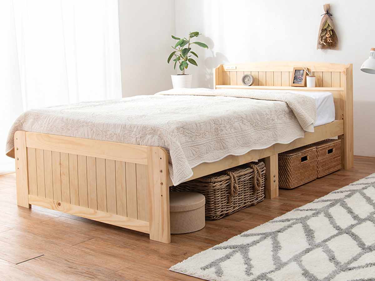 眼鏡や目覚まし時計などの小物を置くことができる宮棚付きです。棚には2口コンセントが付いているので、枕元でライトを灯しながら同時にスマホやタブレットを充電することができます。